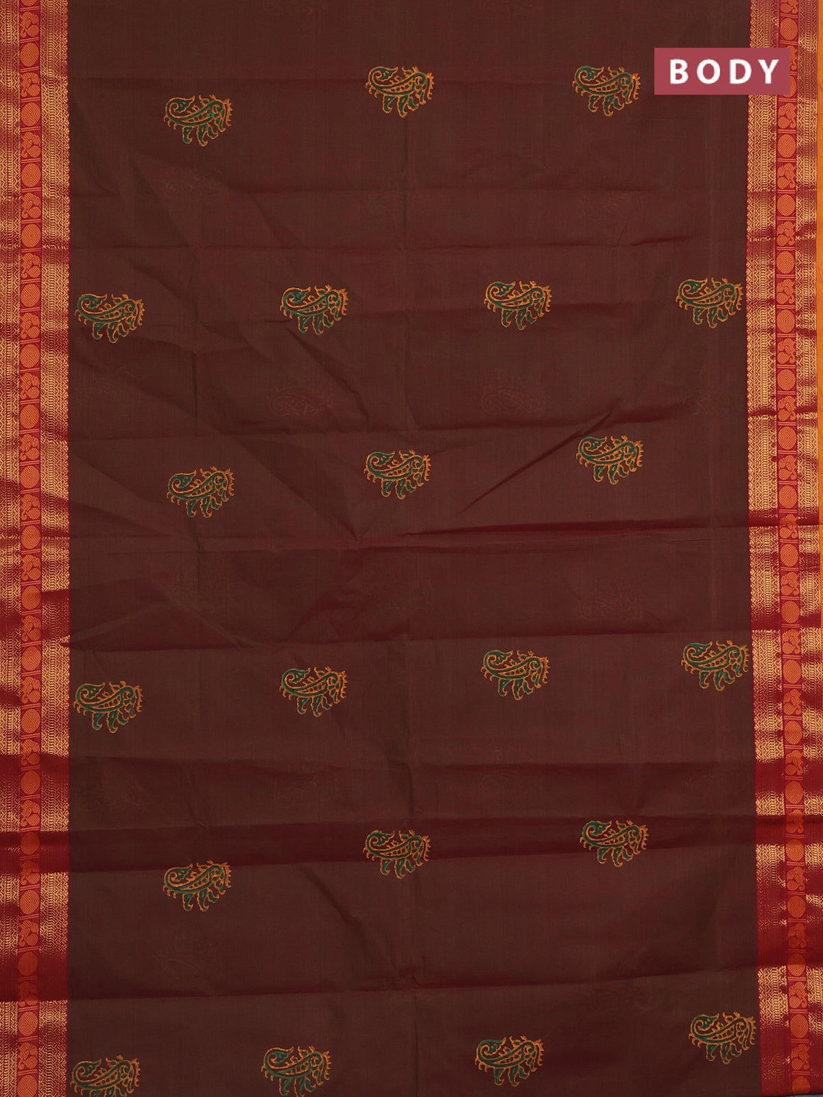 Chettinad cotton saree dual shade of greenish maroon and dark mustard with butta prints and zari woven border