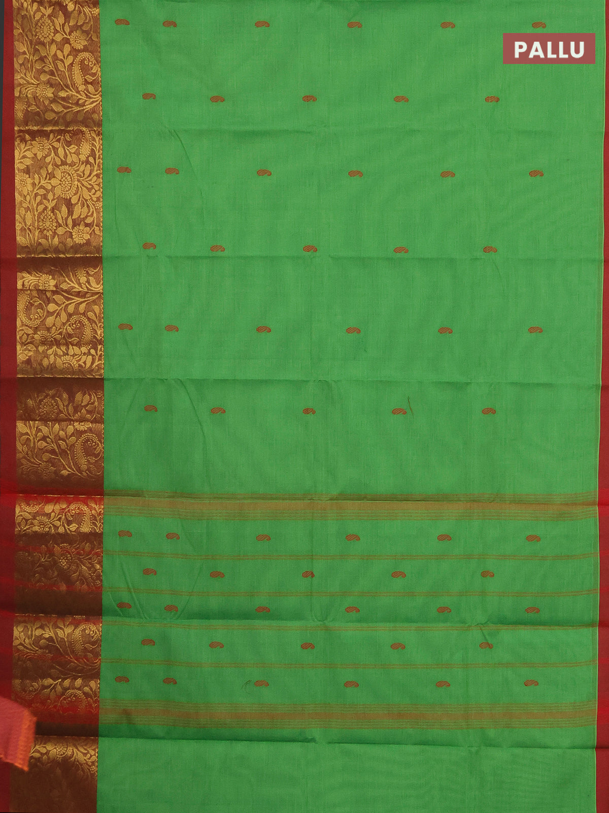 Chettinad cotton saree green and red with thread woven buttas and long zari woven border