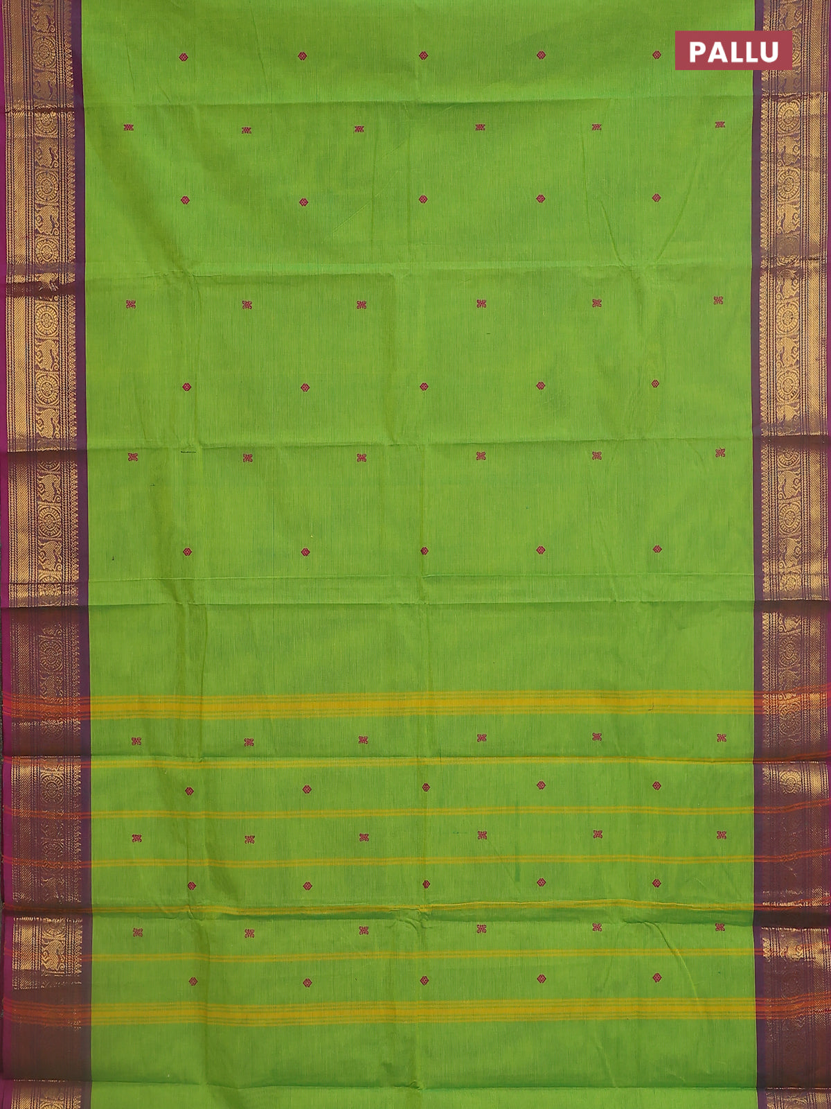 Chettinad cotton saree light green and purple with thread woven buttas and zari woven border