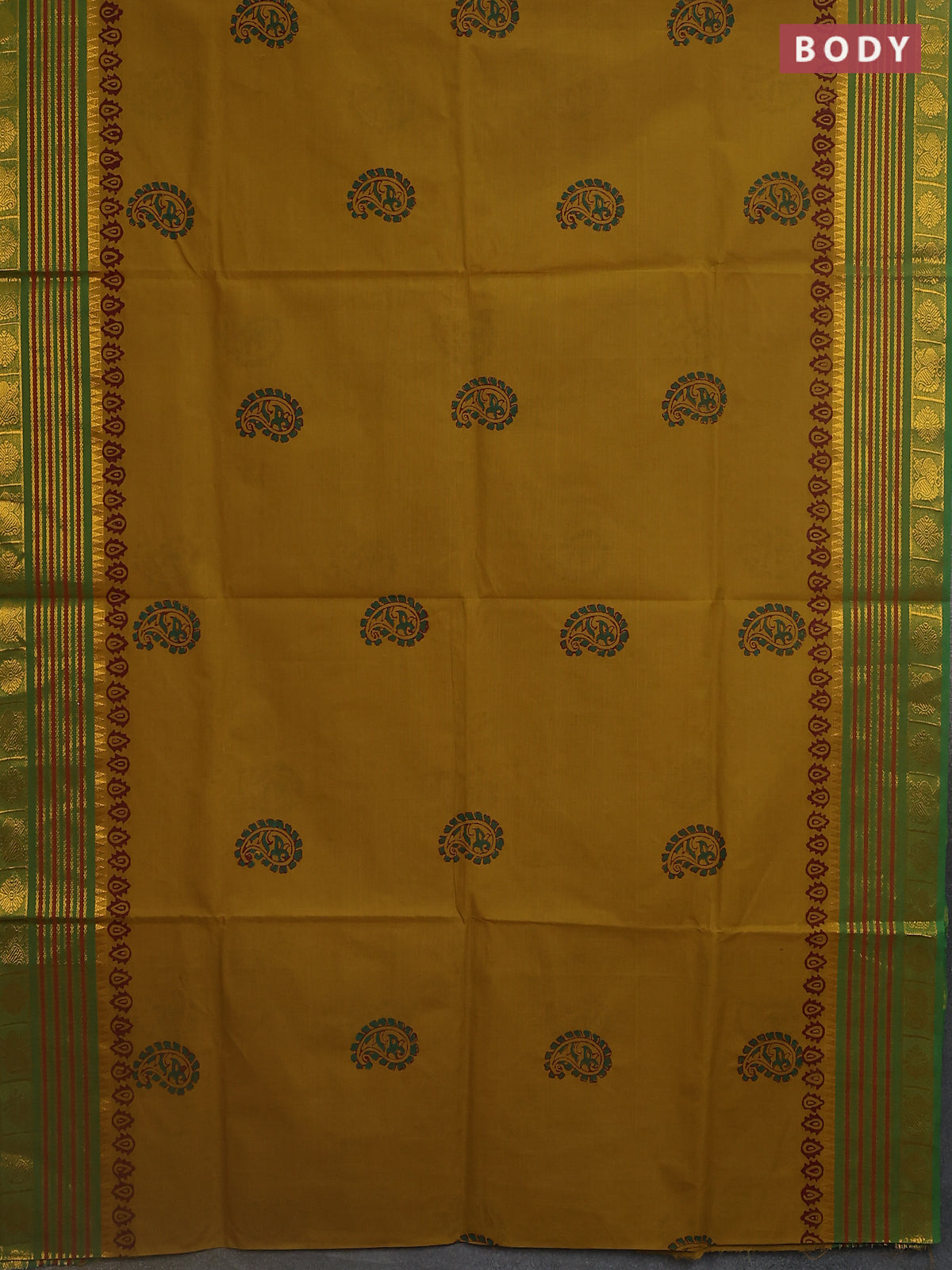 Chettinad cotton saree mustard green and green with butta prints and zari woven border