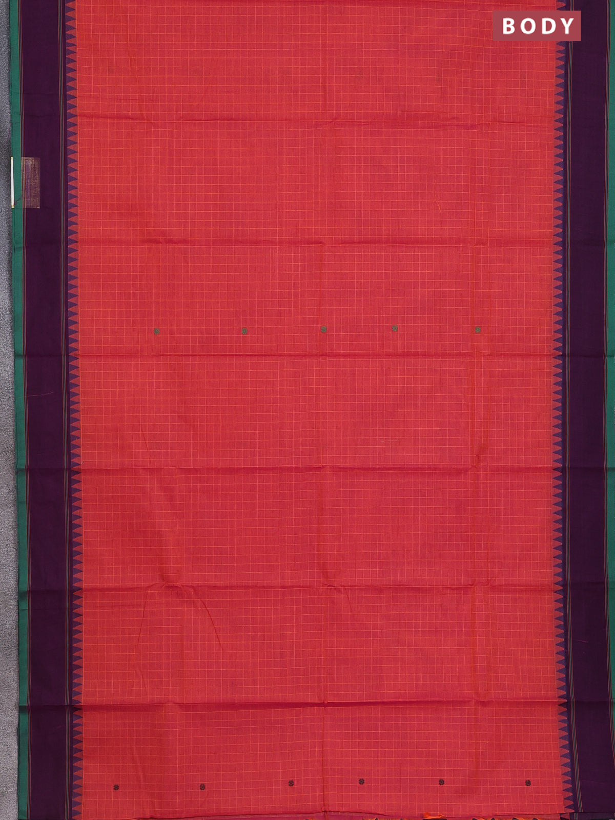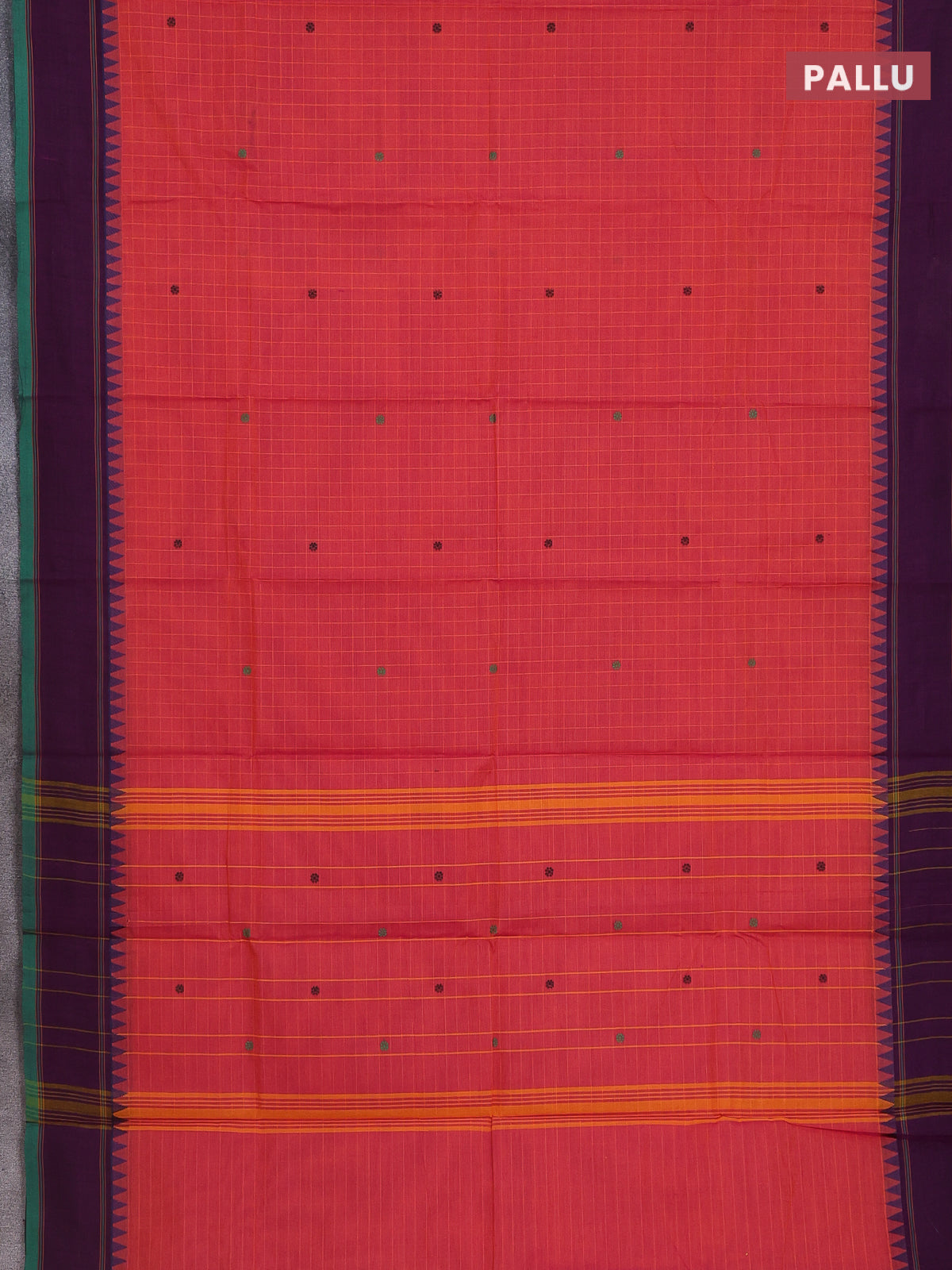 Chettinad cotton saree peach pink and deep purple with allover checked pattern & thread buttas and simple border