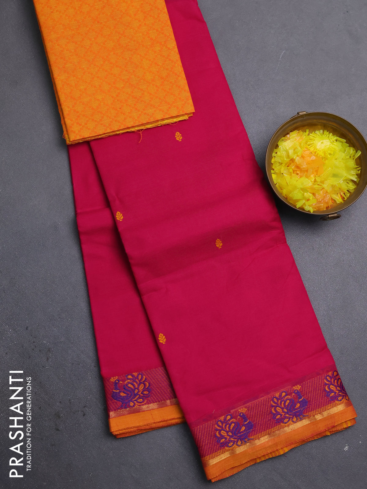 Chettinad cotton saree pink and mustard yellow with thread woven buttas and thread woven border