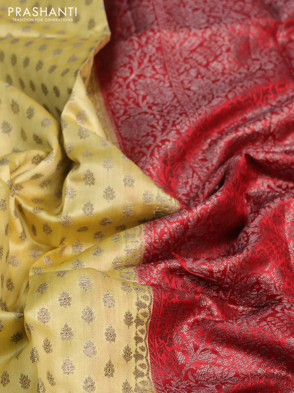 Chiniya silk saree pale yellow and red with allover thread & zari woven buttas and banarasi style border