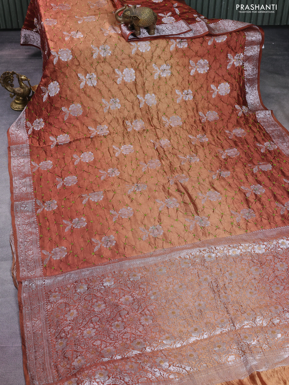 Chiniya silk saree rust shade with allover silver zari buttas & bandhini prints and silver zari woven border