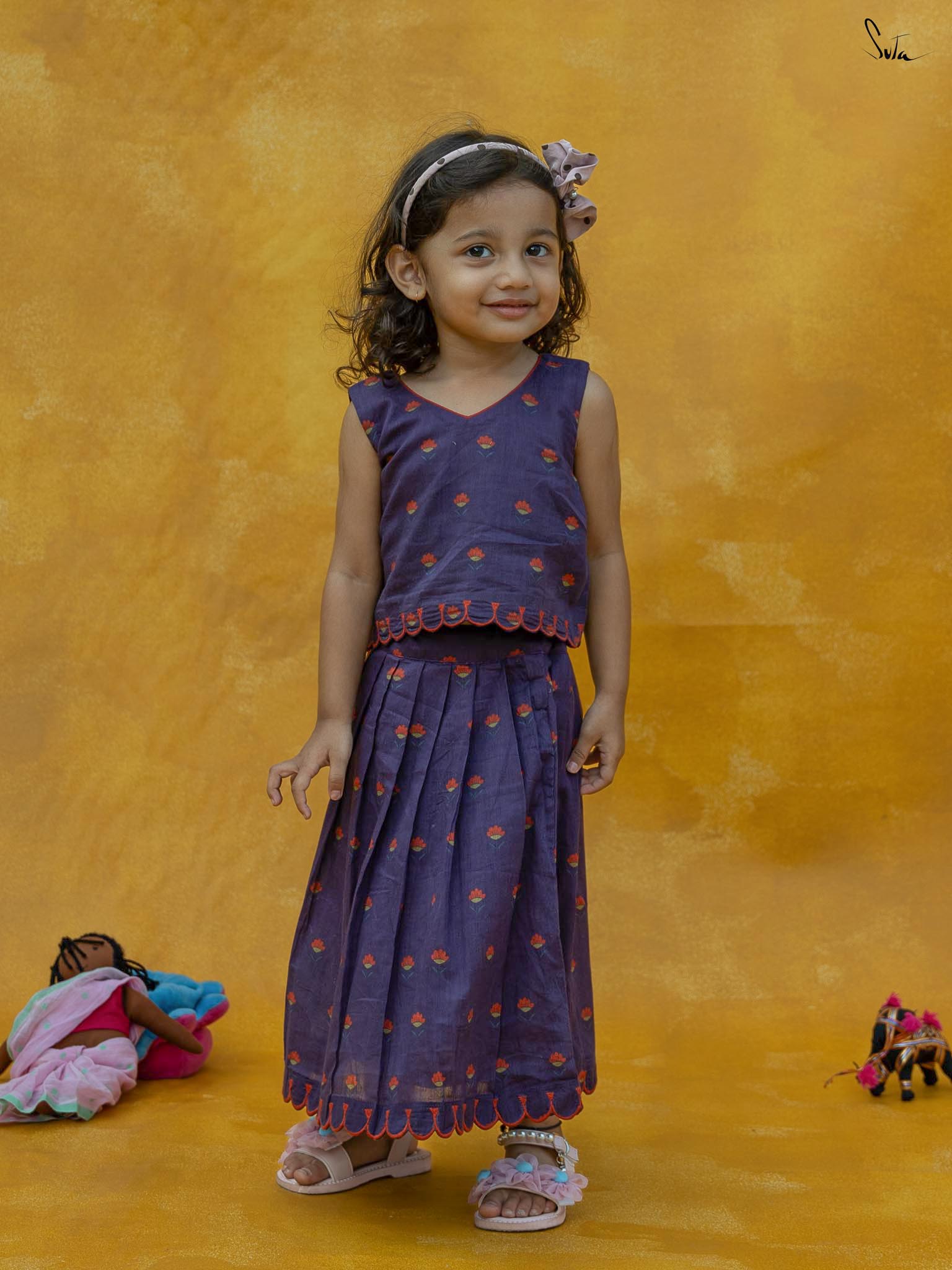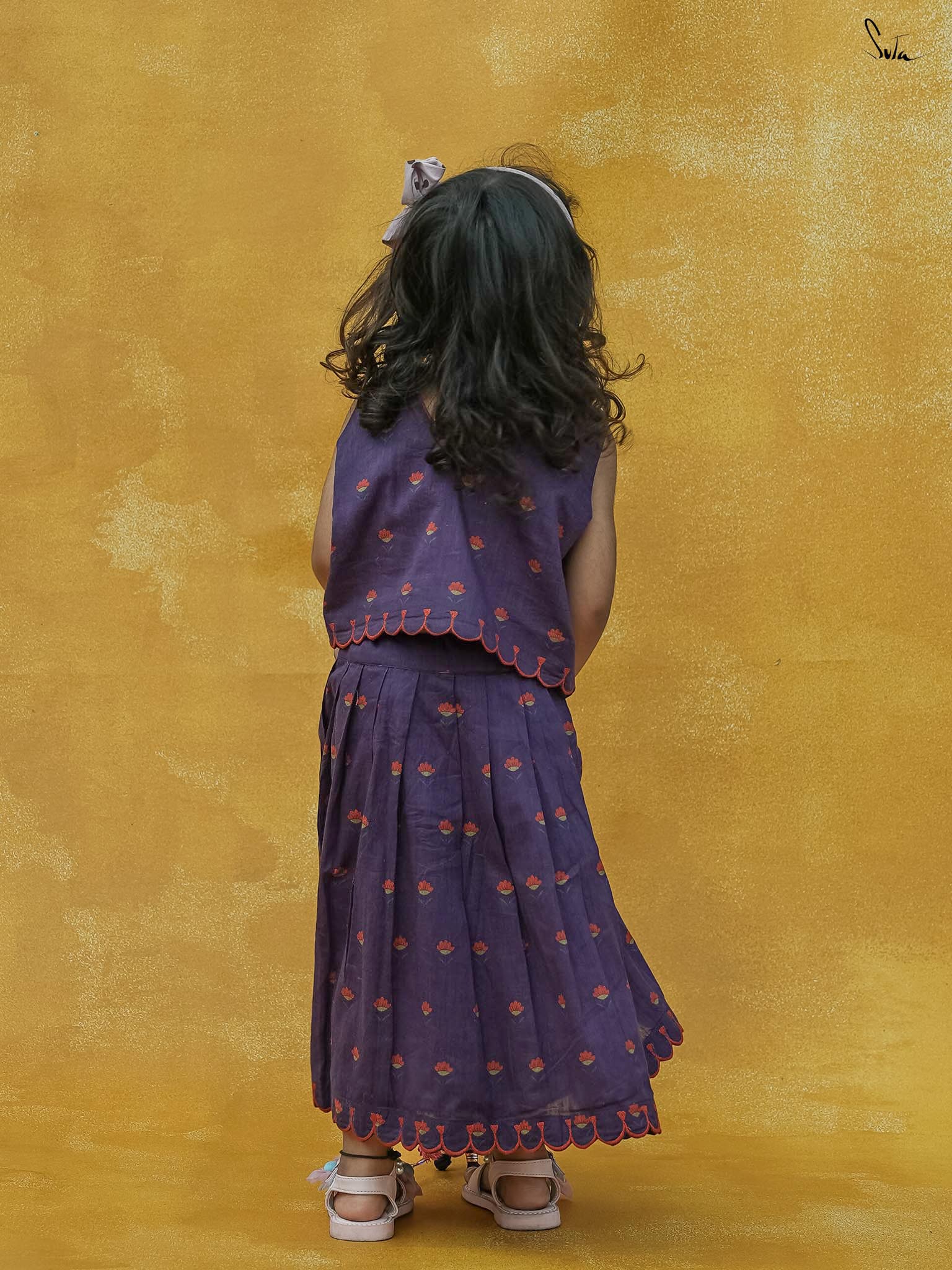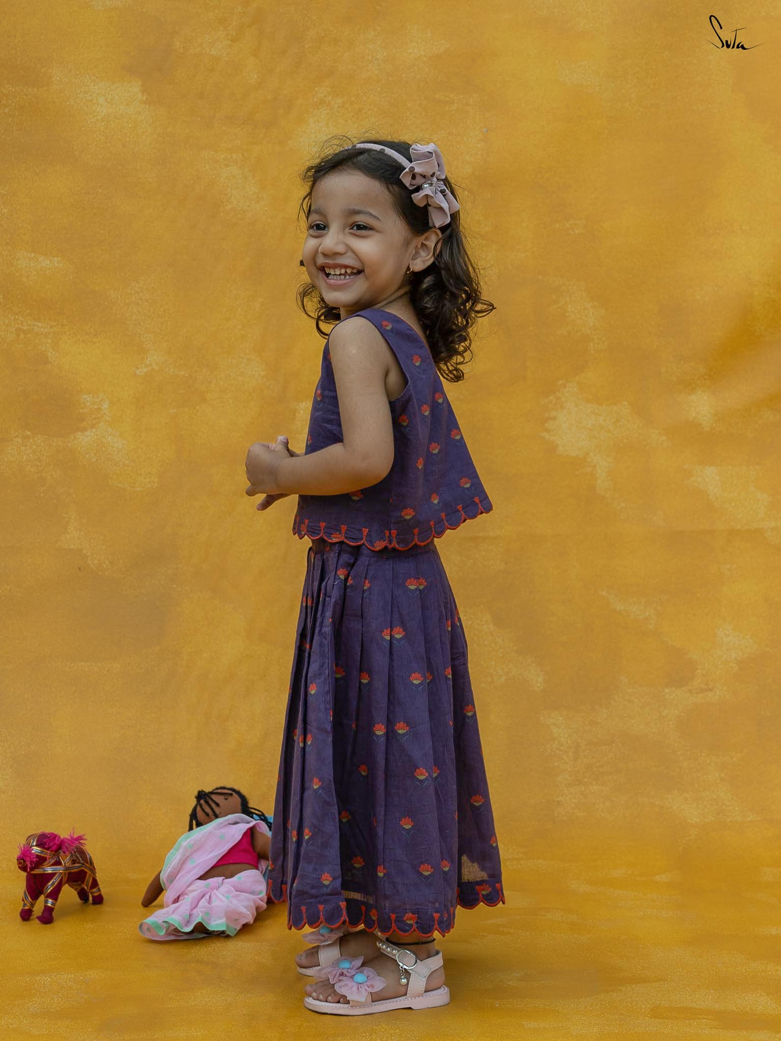 Adorn Chubby Cheeks like your delightful expressions while your child awestruck you with cuteness. The lehenga set in a rich purple floral print is beautifully crafted in cotton with scallop detailing. The outfit celebrates the joy of childhood, allowing your little one to twirl in style.