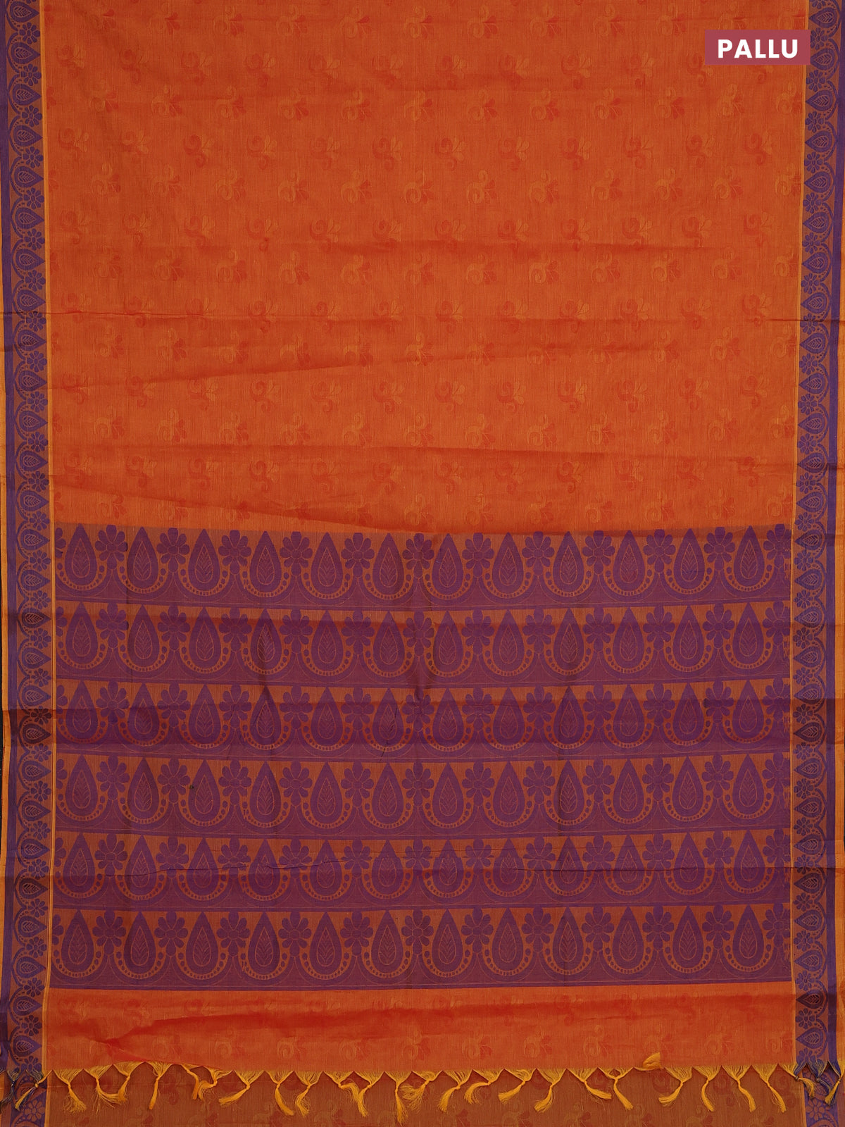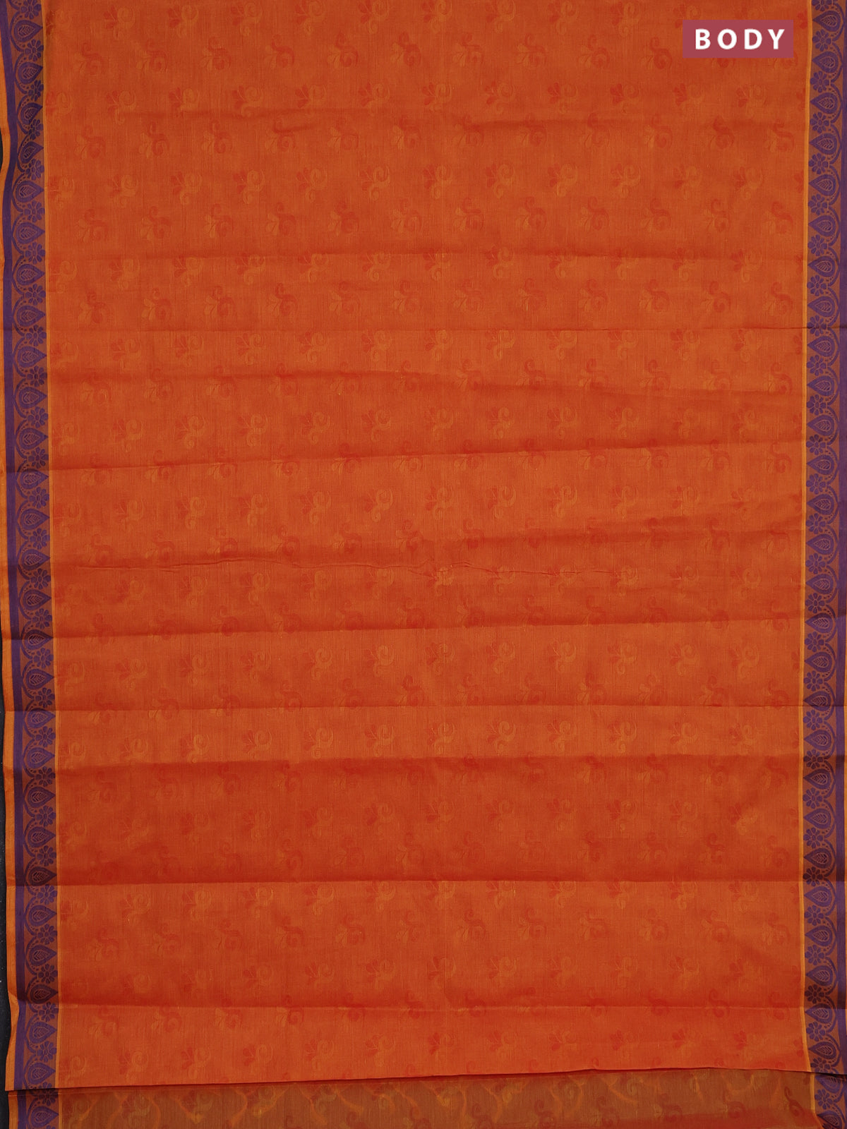 Coimbatore cotton saree dual shade of sunset orange and blue with allover self emboss and thread woven border