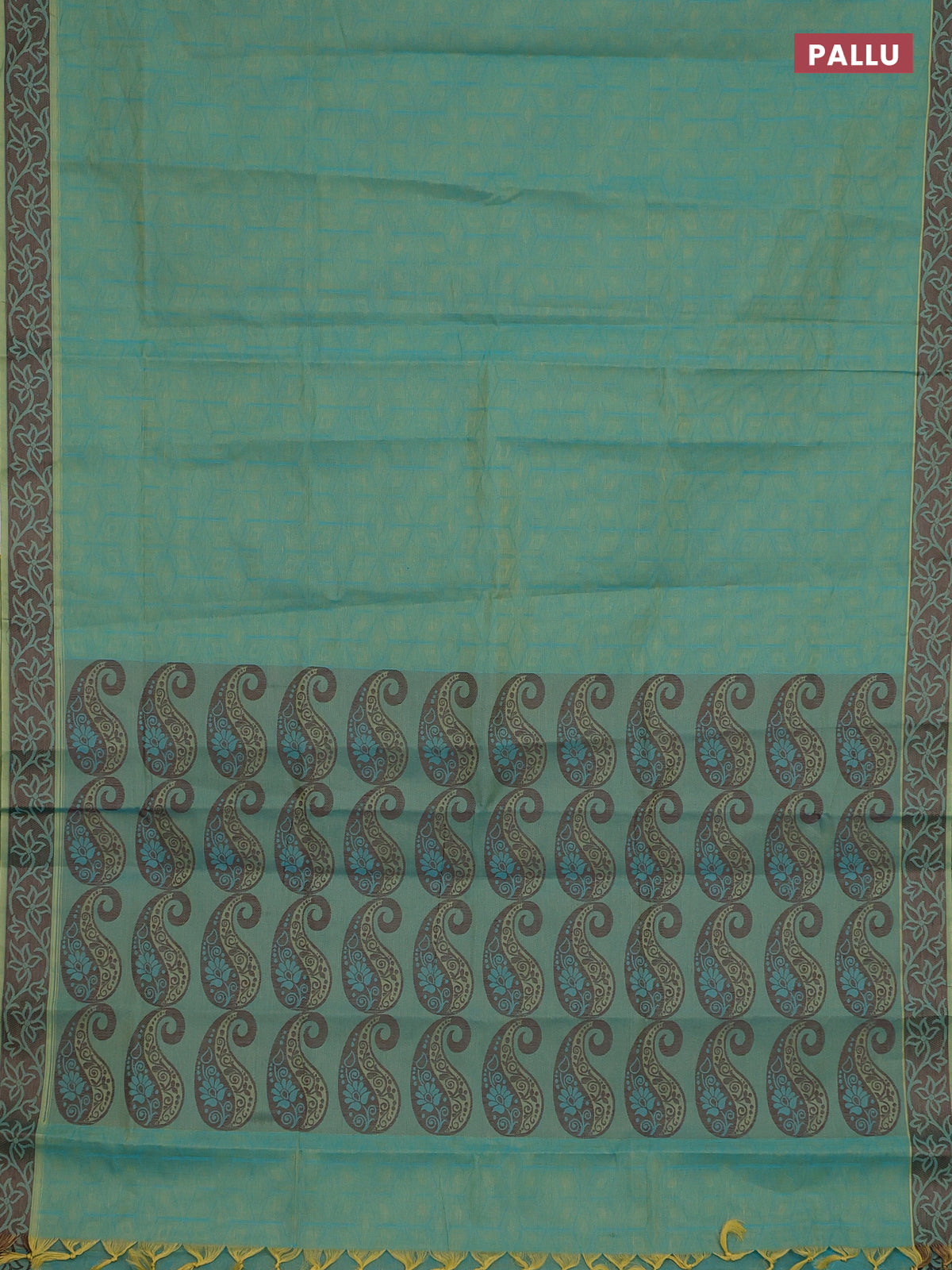 Coimbatore cotton saree dual shade of teal bluish green and coffee brown with allover self emboss and thread woven border