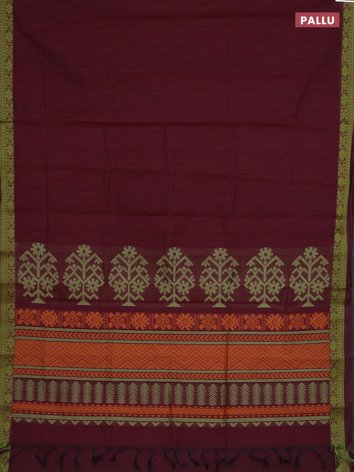 Coimbatore cotton saree maroon and light green with allover self emboss and thread woven border