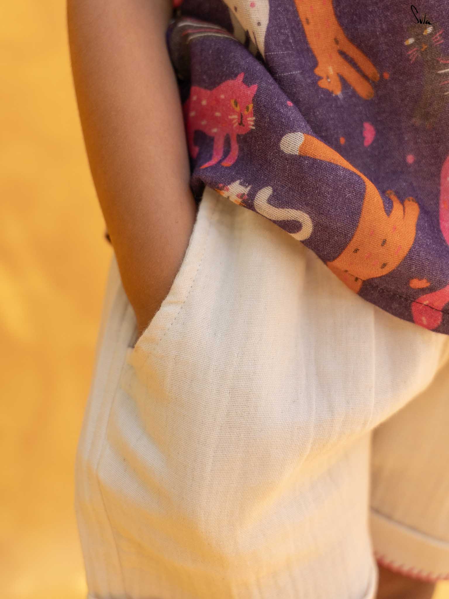 “The cat went fiddle-i-fee…” Zoom like a zigzagging kitty in this fun-packed co-ord! The multi-colored printed shirt is full of personality, with embroidered buttons that dance down the front like a treasure trail. Paired with crisp white contrast pants, featuring delicate buttonhole embroidery at the hems, this outfit is perfect for doodle days, bedtime dances, and every silly moment in between.
