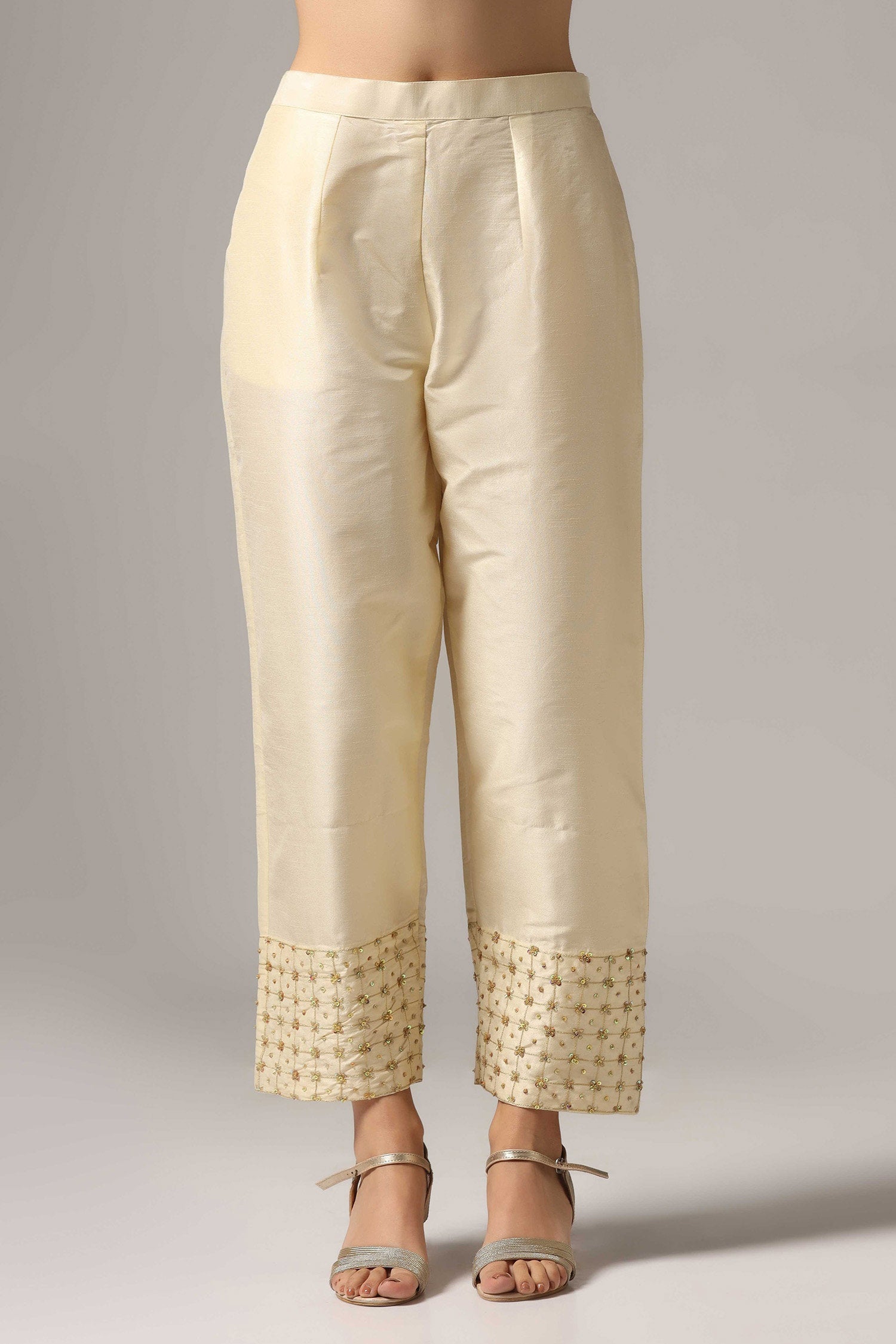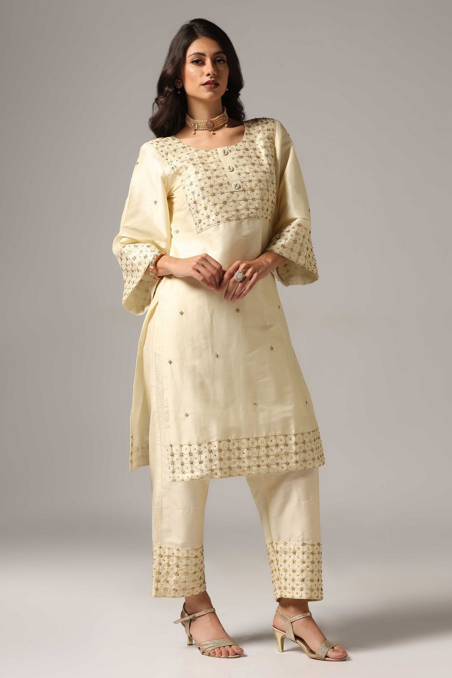 The cream raw silk kurta and palazzo set with matching net dupatta and zari embroidery work for an amazing look with traditional touch with elegance.