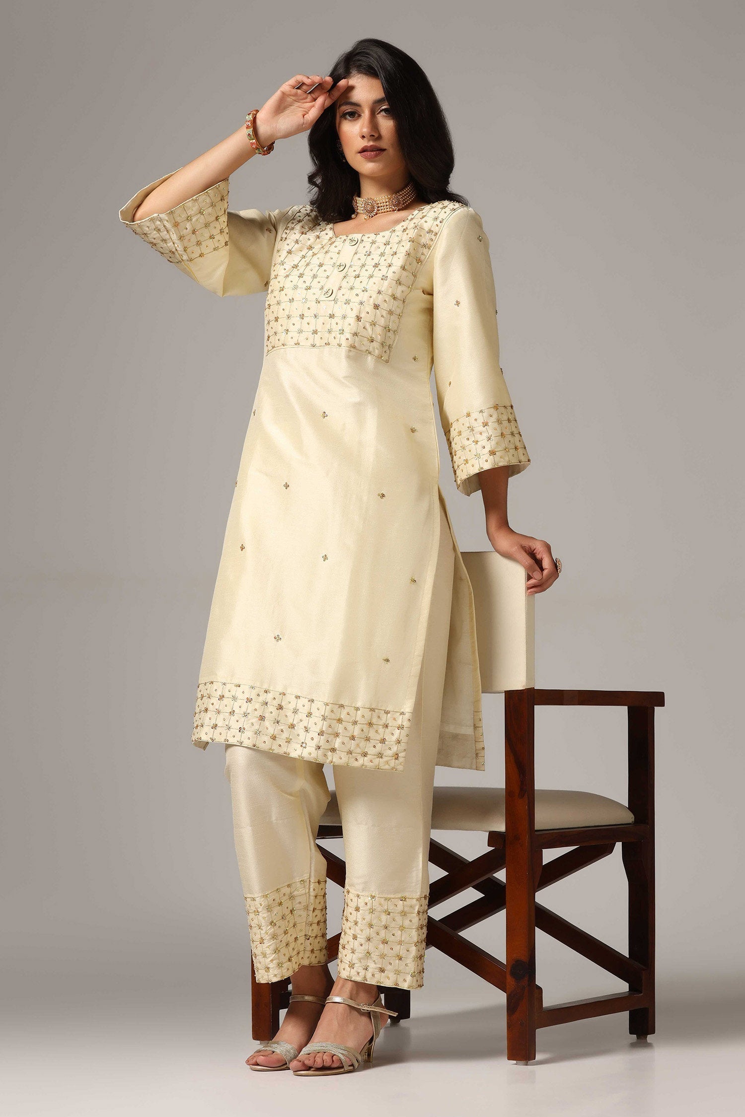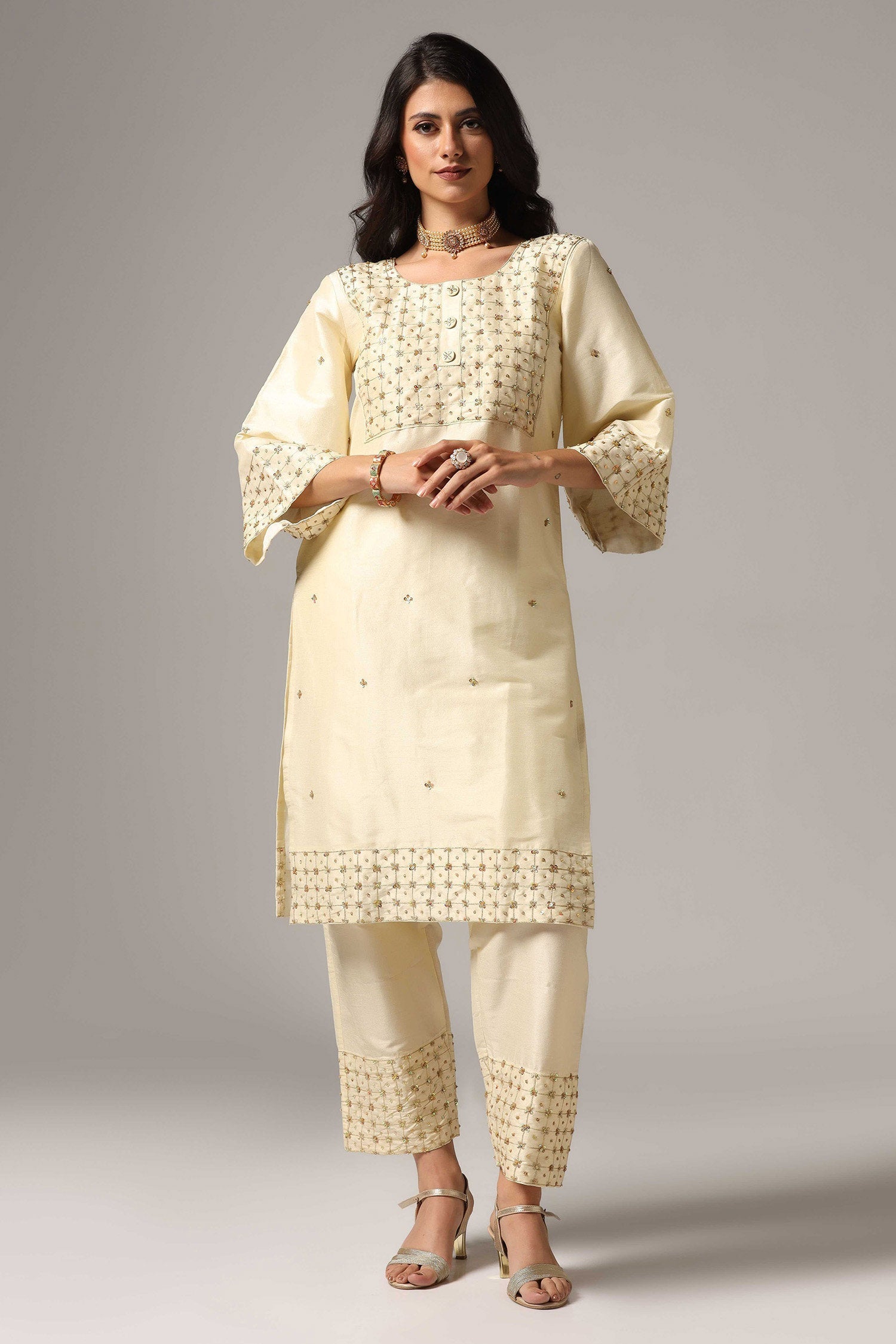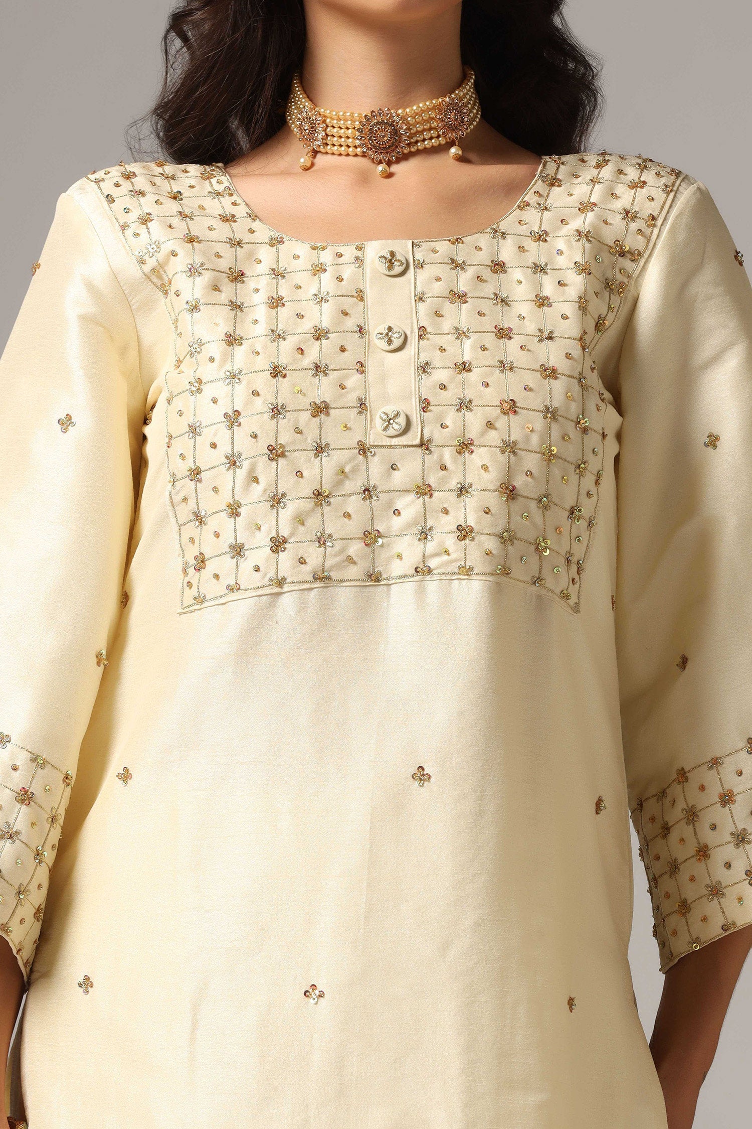 Cream Raw Silk Kurti With Palazzo Pants And Dupatta