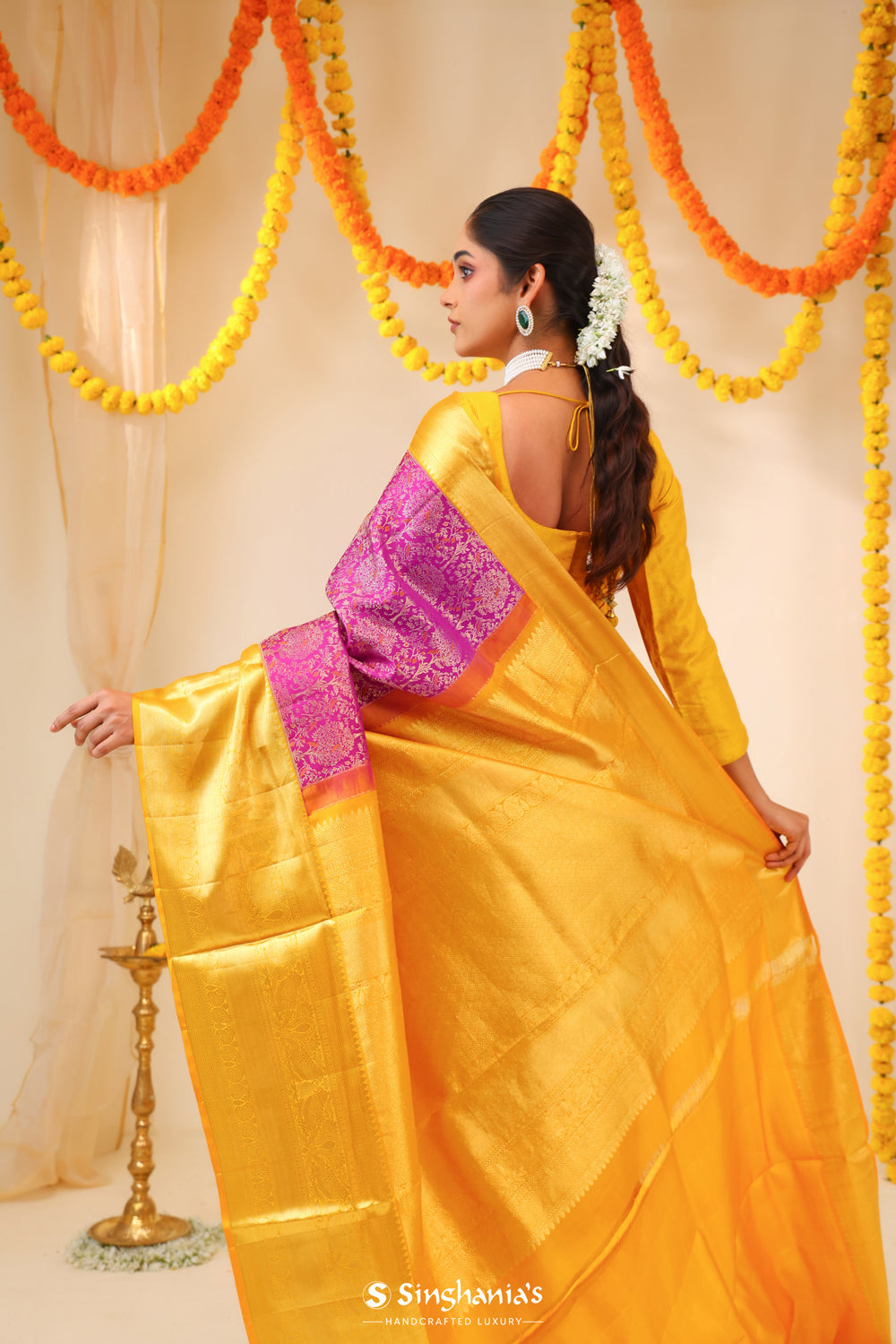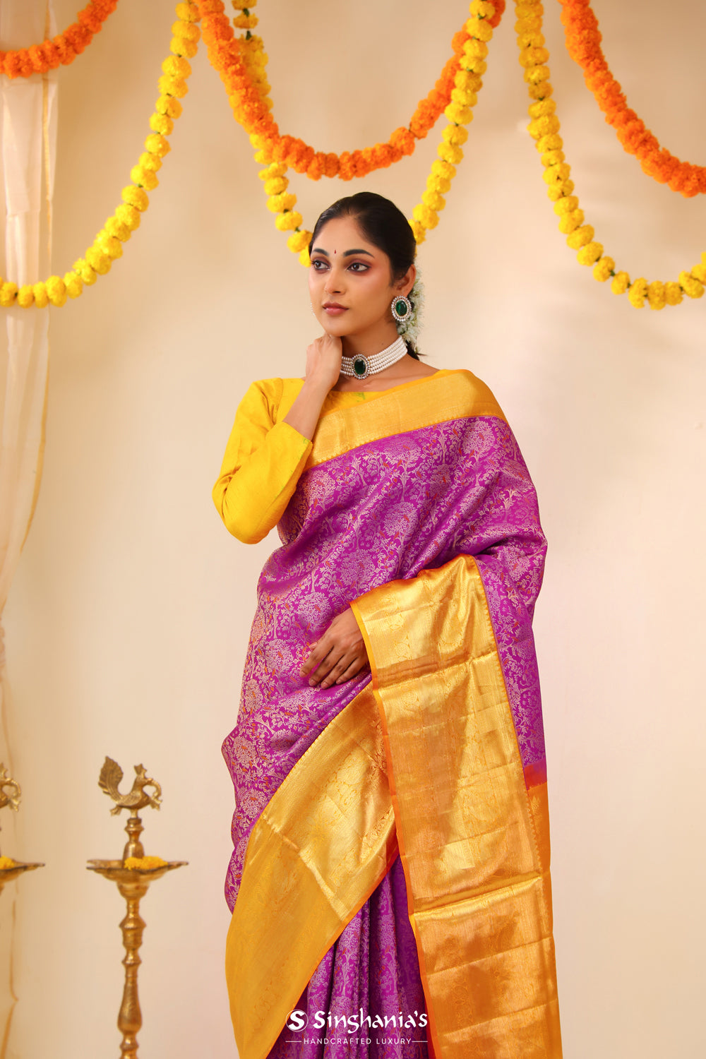 An ornate fusion of cultures - this Dark Magenta Kanjivaram Silk Saree features eclectic gold & tilfi zari woven floral and bird motifs all over. The contrasting yellow big border with floral-paisley and birds pattern, complementing the elegance.