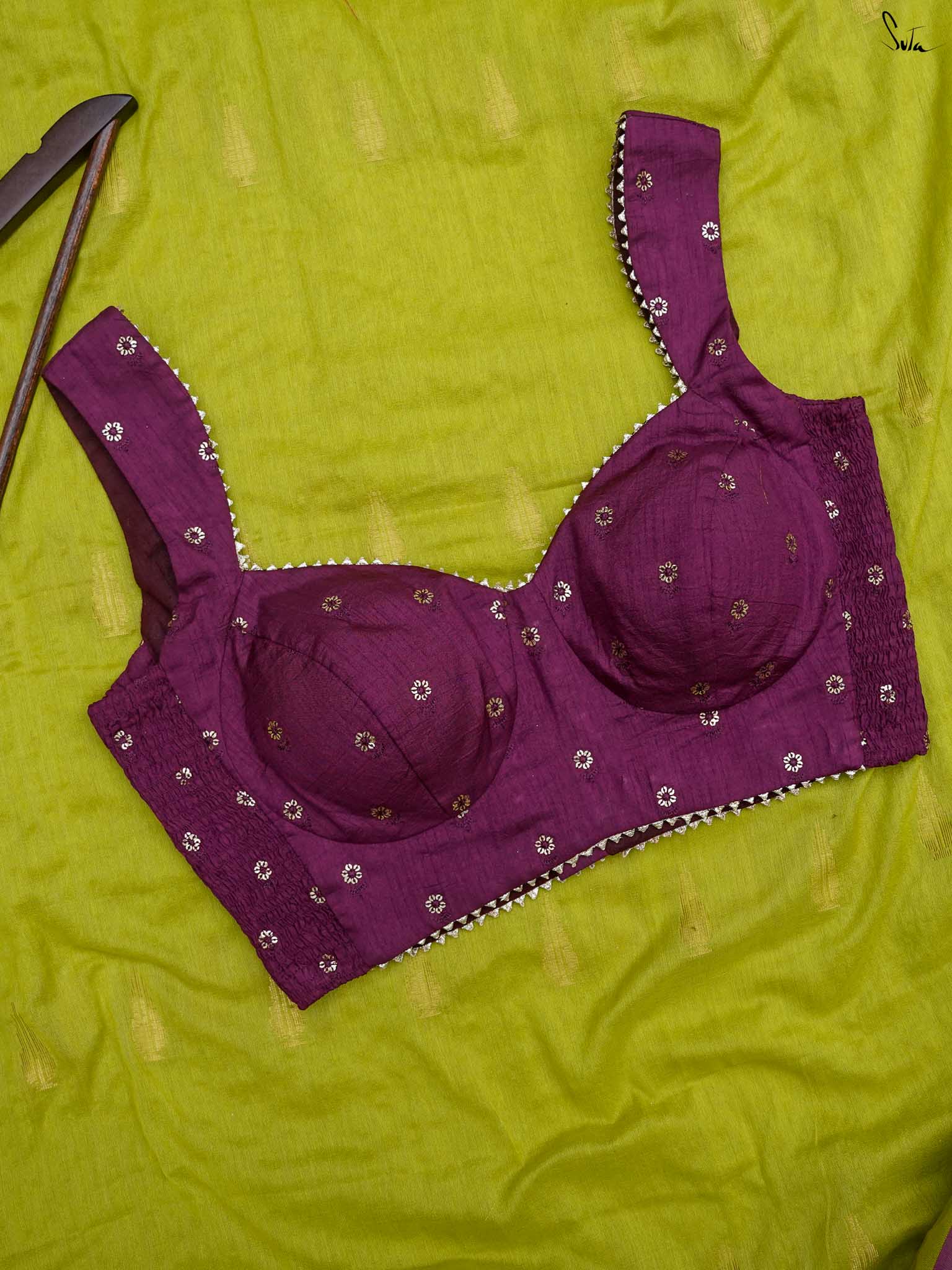 Named after Debjani’s endearing charm, this wine art silk blouse made by her is a must have. The dome neck and sleeveless cut flatter your shoulders, while the floral embroidered buttis add a delicate, artisanal touch. Padded and crafted with side elastic, it fits beautifully.