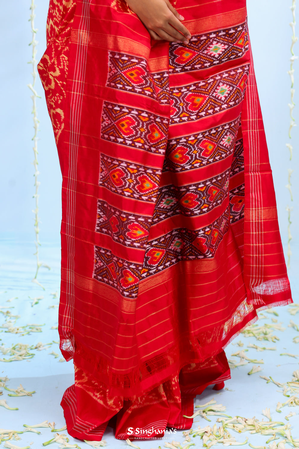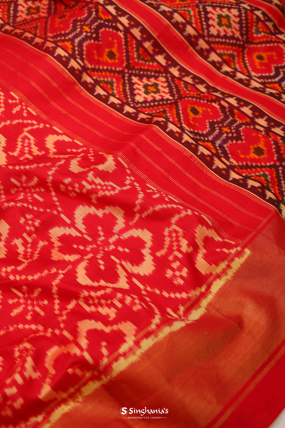 Deep Red Ikkat Patola Silk Saree With Jaal Design