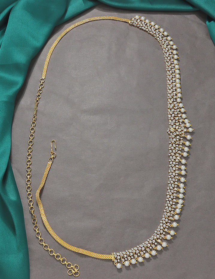 Elevate your traditional attire with this Designer GJ Polish Zirconia Chain Vaddanam, expertly crafted with a blend of gold and rhodium for enhanced durability and lustrous shine. Adorned with sparkling zirconia stones, this chain vaddanam offers refined elegance and complements various ethnic styles, making it perfect for weddings and special occasions. Its intricate design ensures a comfortable yet secure fit, adding both sophistication and grace to your ensemble.