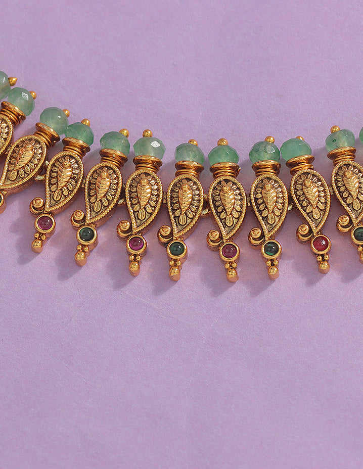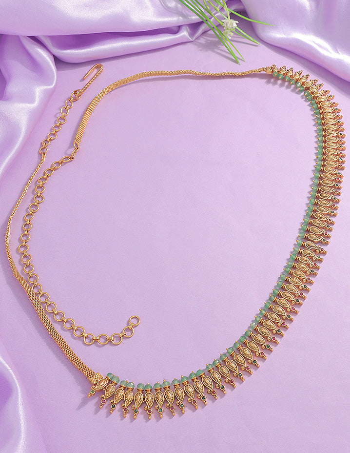 Delicately designed with Kempu stones, this chic and ethnic chain Vaddanam adds a touch of elegance to any outfit. Perfectly pairs with a variety of styles, unleash your creativity with this hip belt.