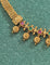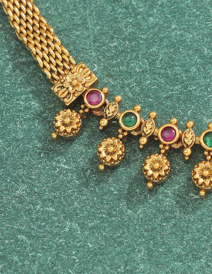 This Designer Kempu Matt Chain Vaddanam features a finely crafted matt finish that adds a subtle sophistication to traditional attire. Adorned with ruby and emerald stones arranged in two elegant lines, it brings a rich blend of color and charm, perfect for accentuating festive and ceremonial looks with expert craftsmanship.