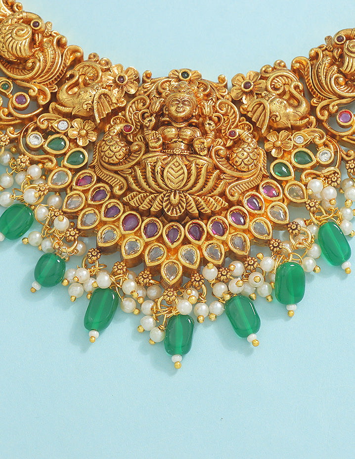 Elevate your bridal ensemble with this Designer Lakshmi Devi Necklace Set, featuring a matt antique polish for timeless elegance. Crafted with intricate detailing and adorned with vibrant green beads arranged in two graceful lines, this set beautifully honors tradition while enhancing your regal look. Perfect for special occasions, it combines classic artistry with expert craftsmanship to complement your bridal attire effortlessly.