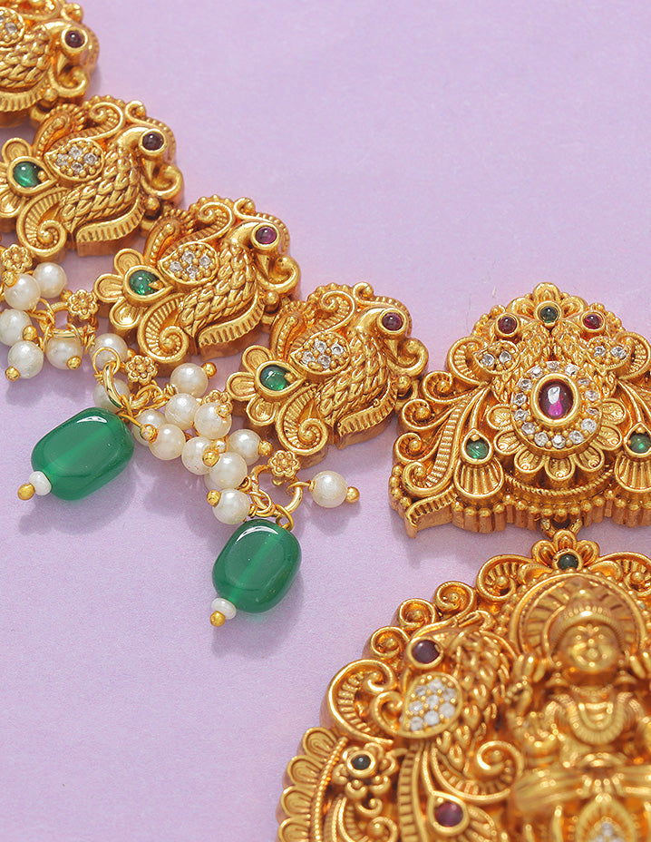This Designer Lakshmi Devi Necklace Set features a stunning peacock design accented with green beads, arranged precisely in two elegant lines. Crafted to symbolize grace and tradition, it adds a refined touch to any festive ensemble.