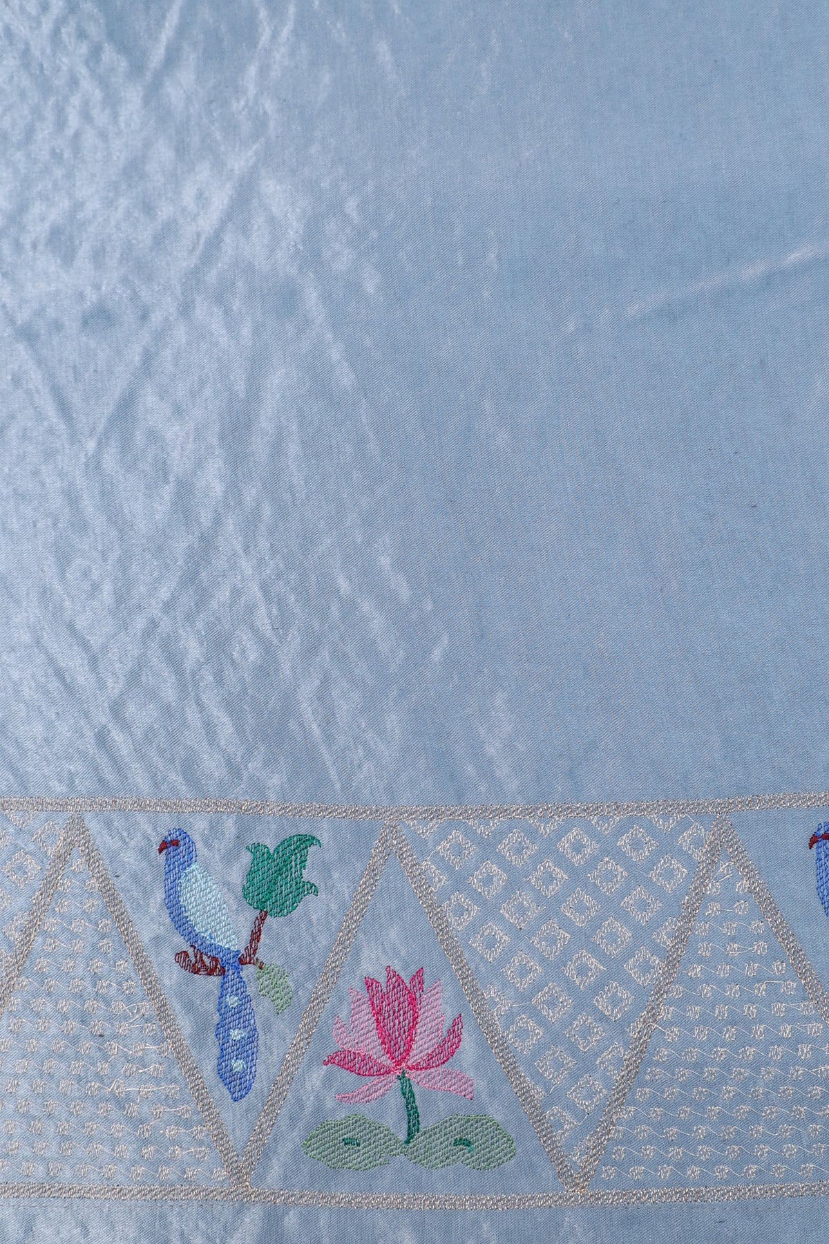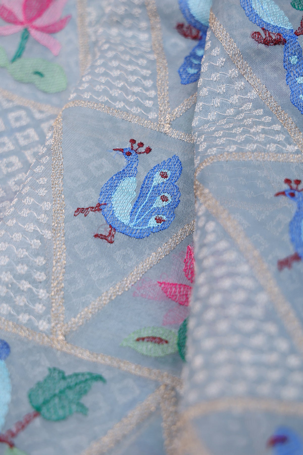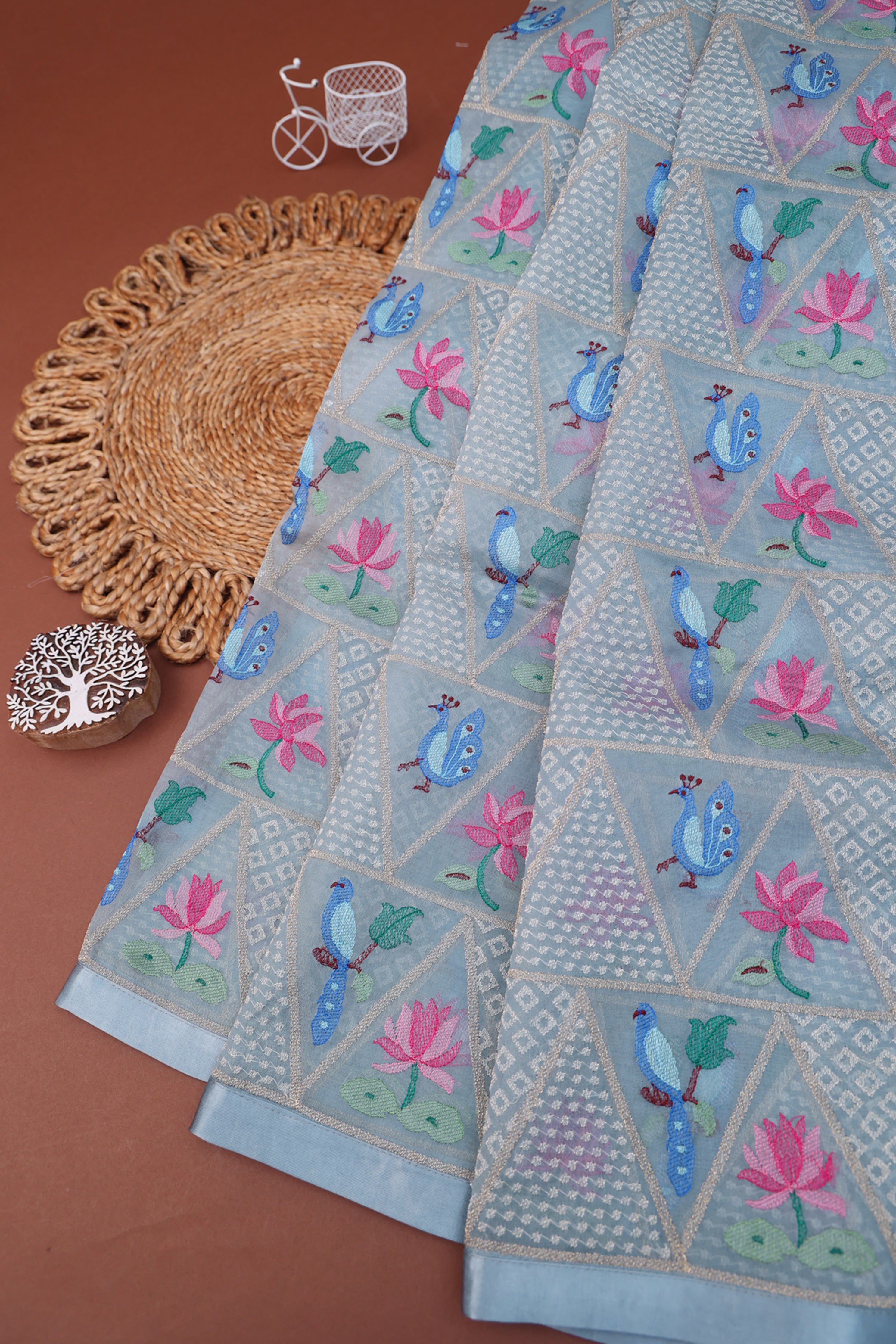 Embody the divine radiance akin to the sun and the brilliance of a star with our elegant Designer Matka Silk Grey Saree. Delicate florals and birds in geometrical shapes gracefully dance across the body, complemented by a self piping border reflecting sublime elegance. Completing this exquisite ensemble are the running pallu and the self with border border blouse, embodying the timeless tradition.
