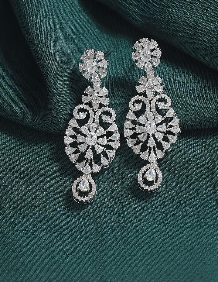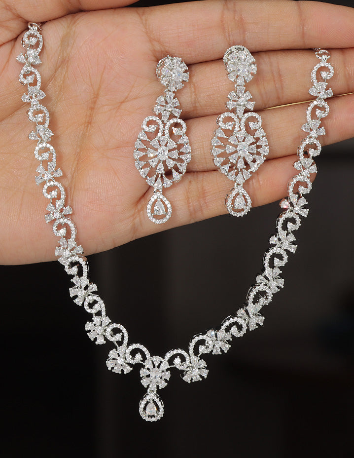 A radiant Rhodium-toned necklace and earring set adorned with sparkling Bud and floral motifs, perfectly blending elegance and charm for your special occasions.