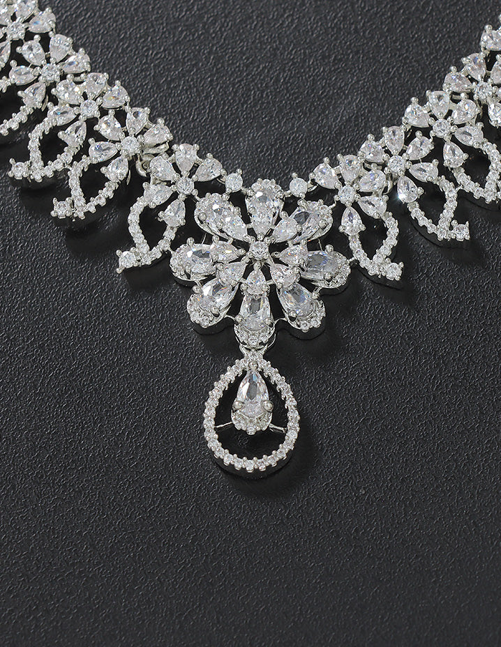 A radiant silver-toned necklace and earring set adorned with sparkling Bud and floral motifs, perfectly blending elegance and charm for your special occasions.