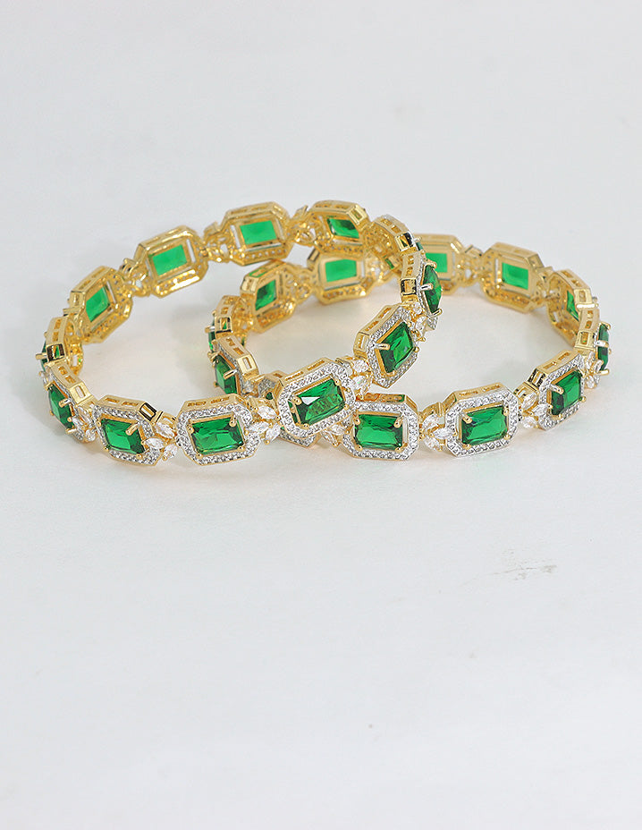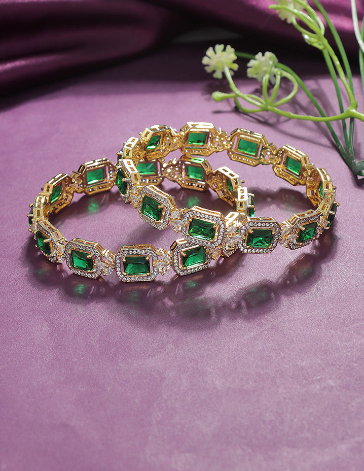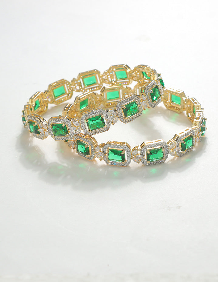 A luxurious blend of elegance and sparkle, these bangles showcase brilliant emerald-cut green stones framed with shimmering white crystals. Set in a radiant gold finish, they are perfect for elevating your look at weddings, parties, or festive occasions.