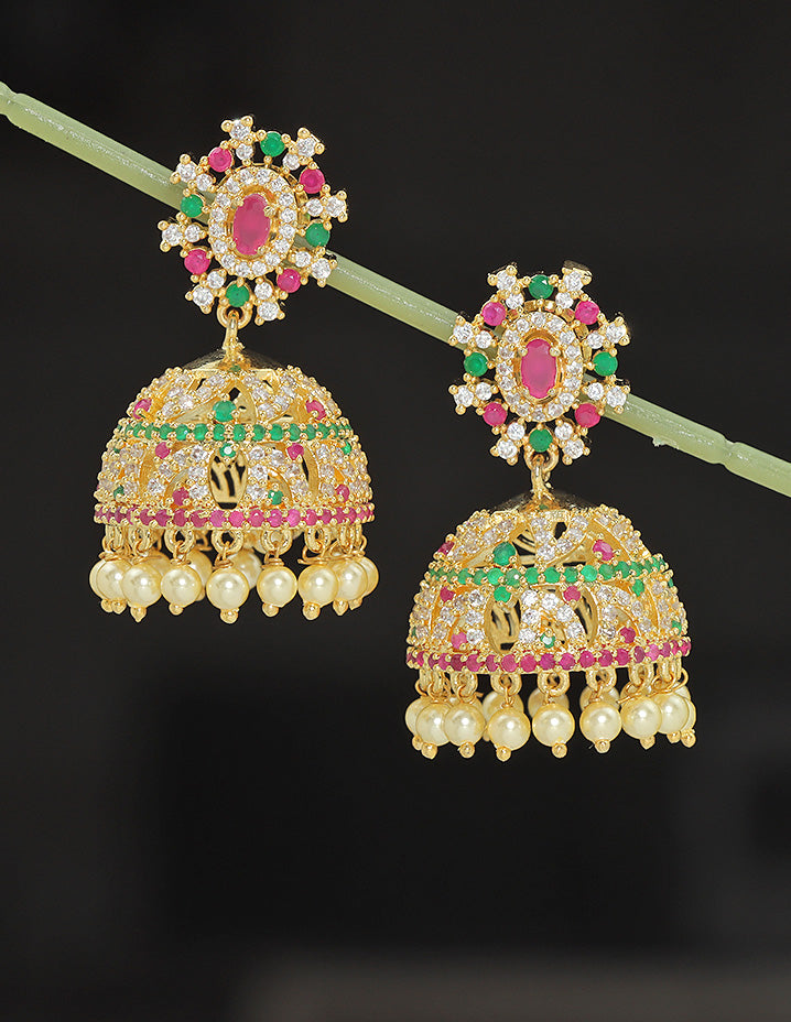 Shine bright with these gold-plated jhumkas, studded with ruby, Emerald and white American diamonds. A bold fusion of elegance and tradition — perfect for any occasion!