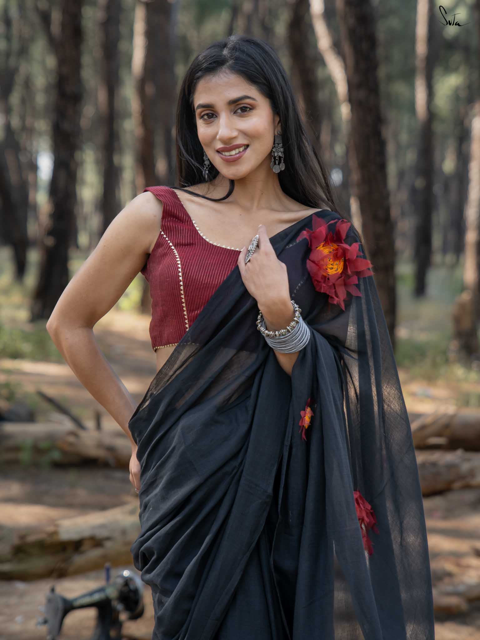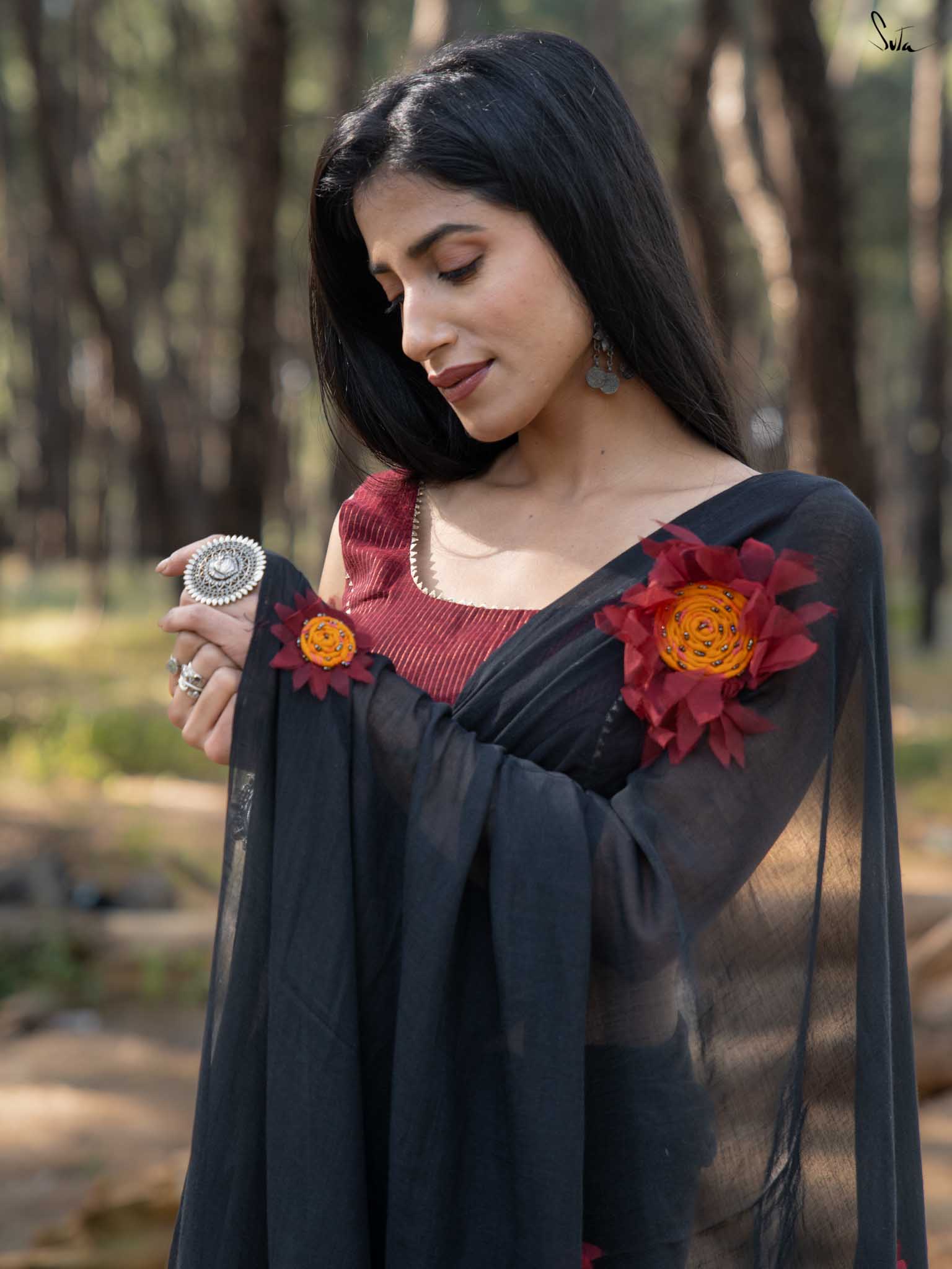 This saree is timeless elegance with a blooming twist. The soft black mul cotton drapes like a dream - lightweight, breathable, and endlessly flattering, making it a perfect go-anywhere, glow-everywhere piece.