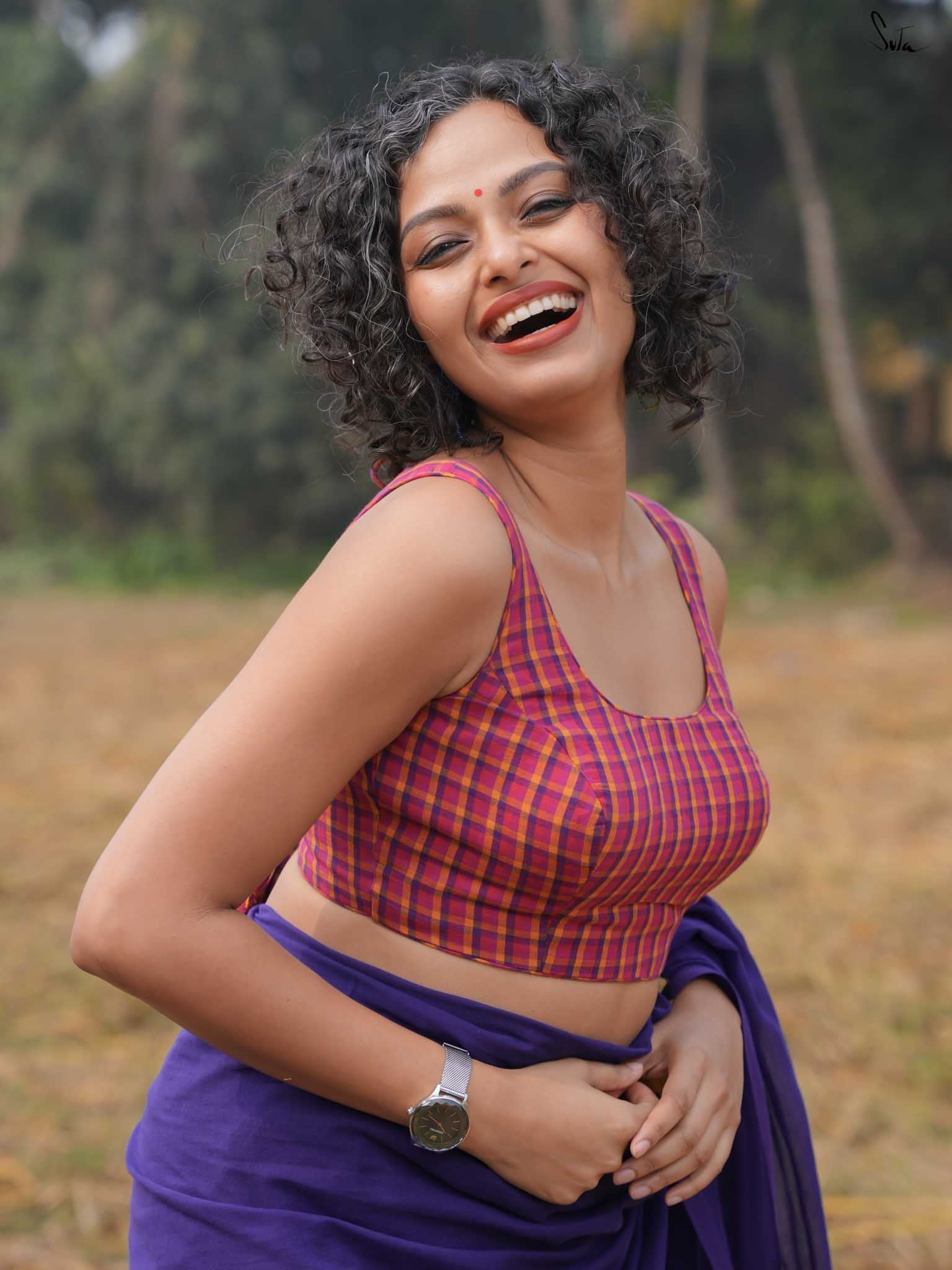 The model is wearing size S blouse and the saree is Dipped in Sunflower