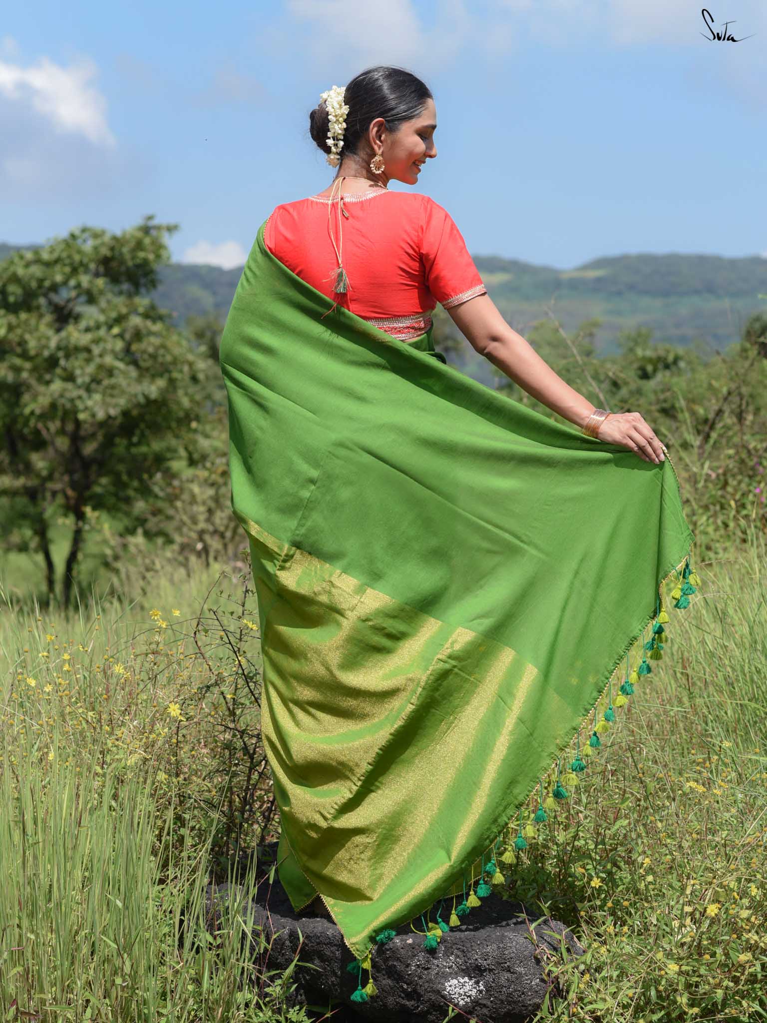 Celebrate the spirit of festivity with Dipped in Matcha, a cotton-acrylic saree designed in a captivating half-and-half pattern. One side shimmers in gold zari while the other glows in deep green, complemented by intricate Gota patti lace that adds a touch of traditional charm. Expertly woven with care, this saree is perfect for weddings, festive occasions, or any moment where elegance meets celebration.