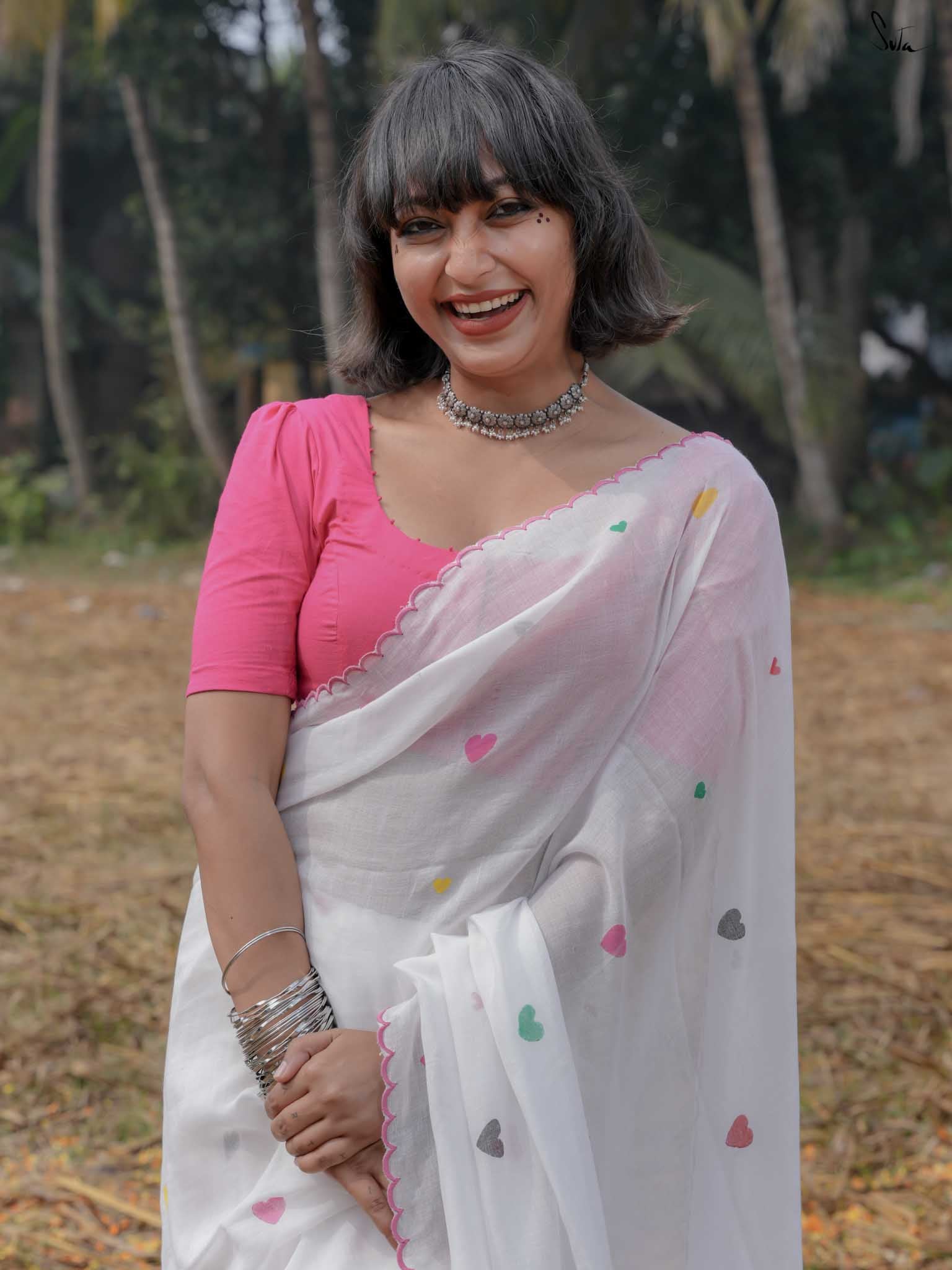 The model is wearing size S blouse and the saree is Dipped in Hearts