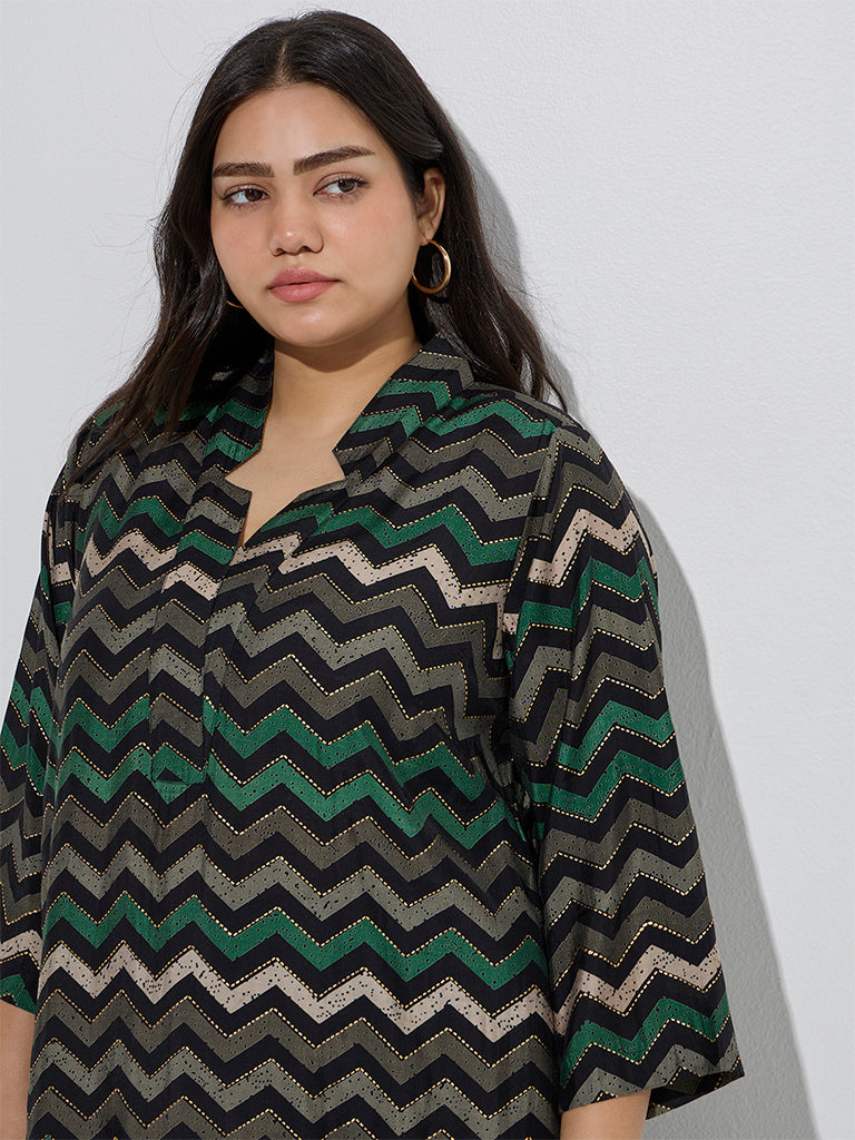 Revamp your ethnic wardrobe with this stunning black A-line kurta from Diza. Its captivating chevron patterns add a touch of modern artistry, while the breathable fabric ensures all-day comfort. Designed with a distinctive asymmetrical neck and elegant three-quarter sleeves, it's perfect for making a memorable impression.