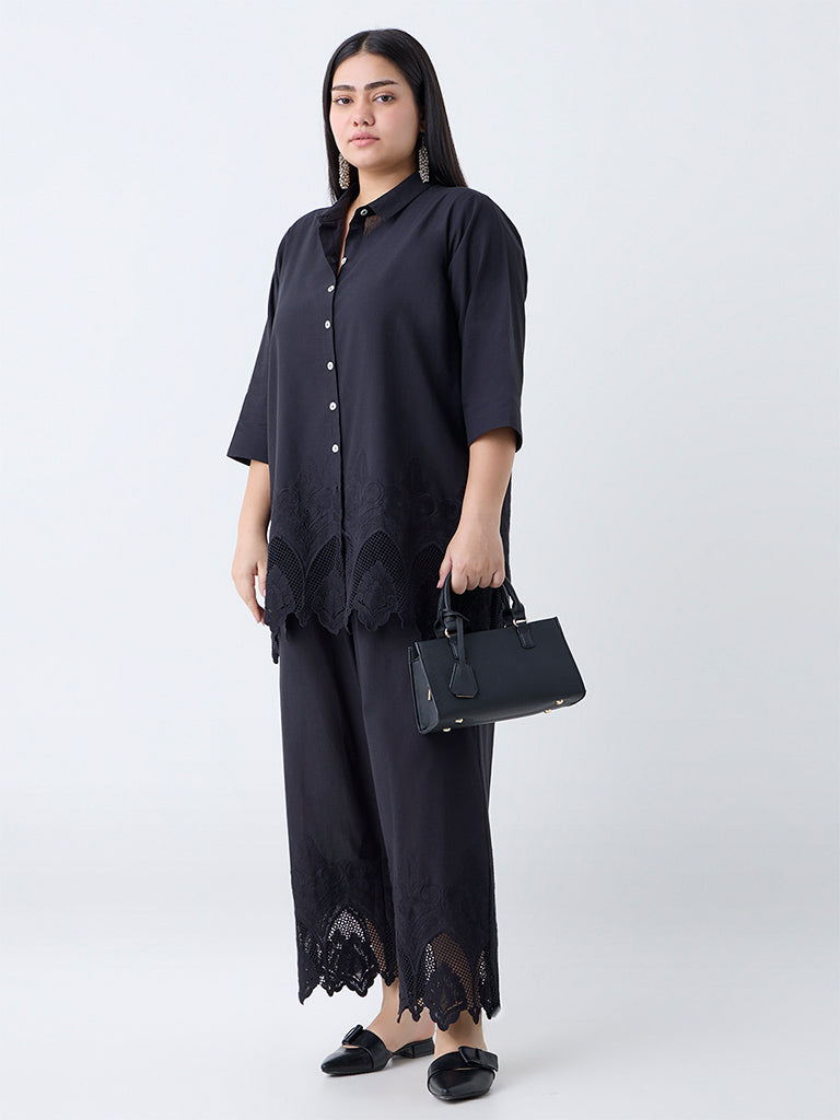 Add a sophisticated charm to your wardrobe with this black cotton tunic from Diza. Beautifully detailed with floral embroidery along the hem, it features a smart spread collar, a button-down front, and full sleeves. Perfect for creating an effortlessly elegant look for both work and casual outings.
