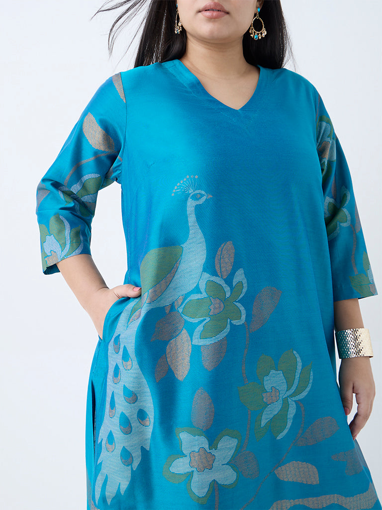 Shaped in a flattering A-line silhouette, this blue kurta from Diza is elevated with nature-inspired prints that feel festive yet versatile. Milled from premium fabric, it’s styled with a flattering V-neck, three-quarter sleeves, and a slip pocket for a balance of elegance and ease.