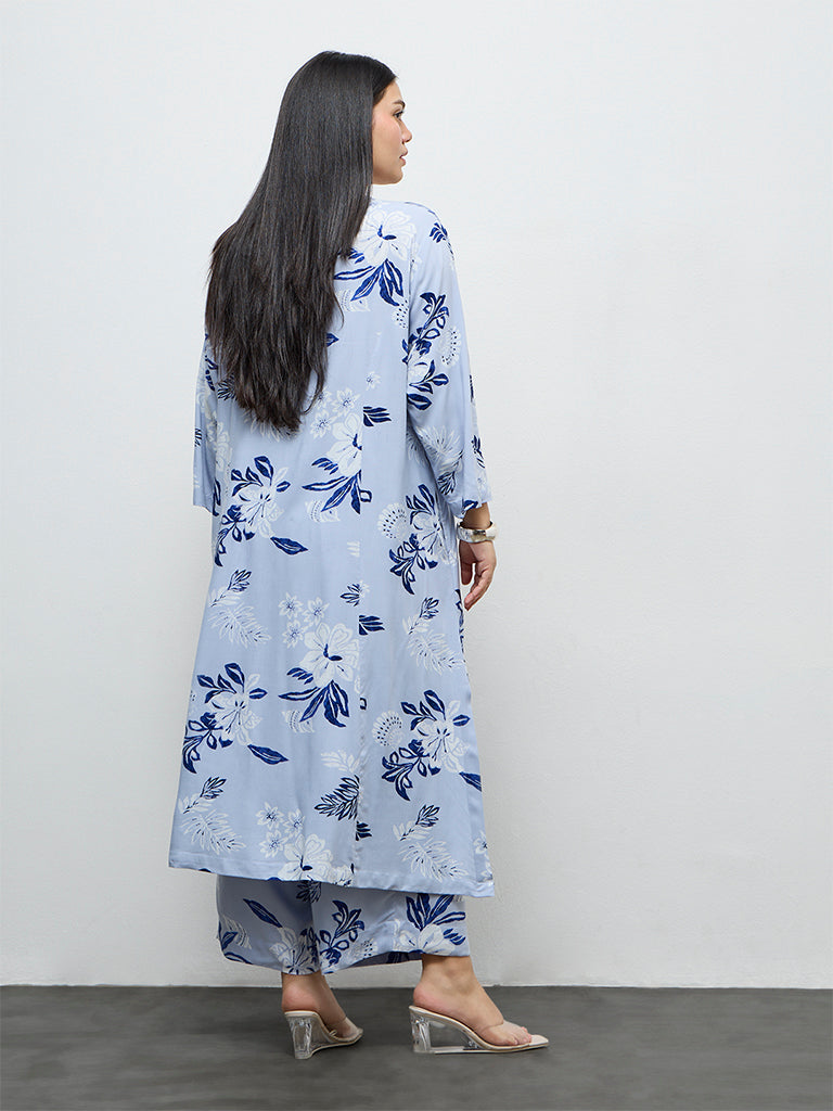 Diza Dusty Blue Botanical Printed A-Line Kurta