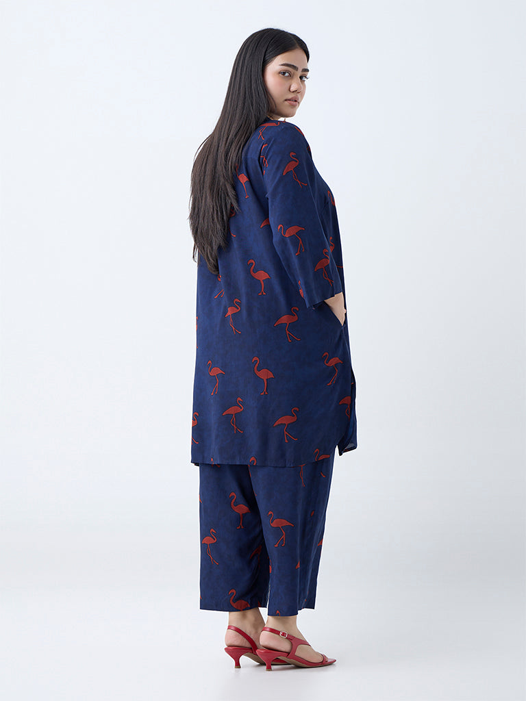 Bring a playful twist to your ethnic wardrobe with this navy kurta from Diza. Fashioned with a lively flamingo print, it’s cut in a flattering A-line frame and styled with a collar, button placket, flared sleeves, and a slip pocket.
