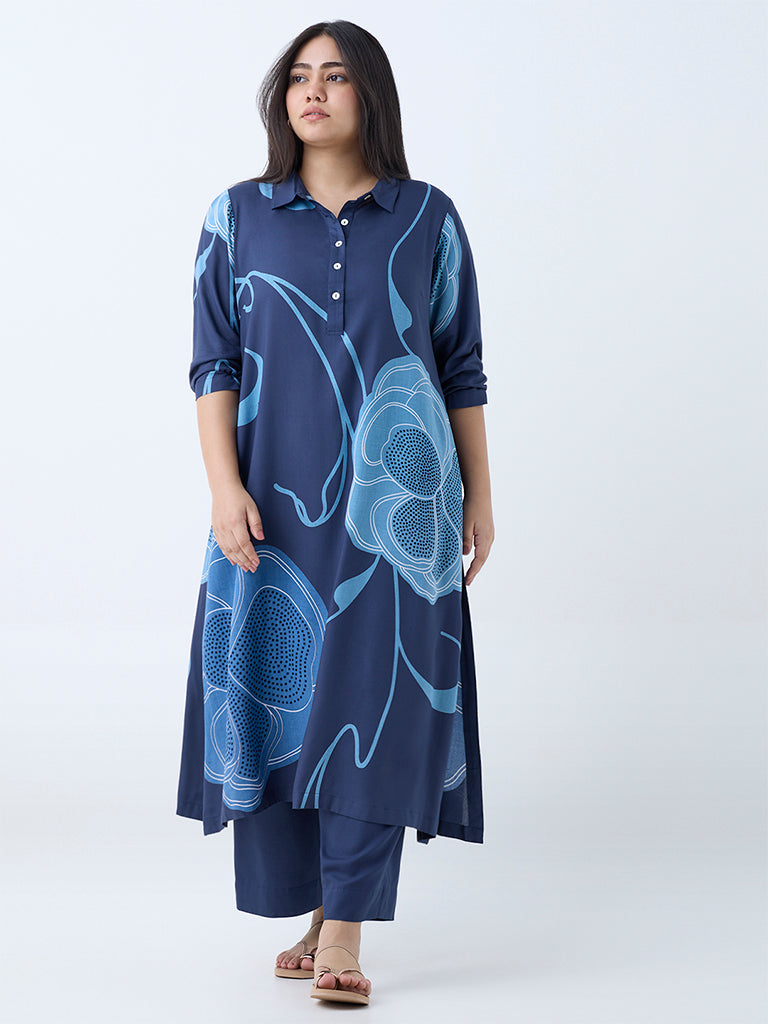 This navy kurta from Diza is highlighted with vibrant floral motifs that lend a touch of statement to its everyday appeal. Spun from quality fabric in a flattering A-line silhouette, it features a collar, a brief button placket, and three-quarter sleeves. A discreet slip pocket adds practical ease, making it a functional pick for occasion-ready dressing.