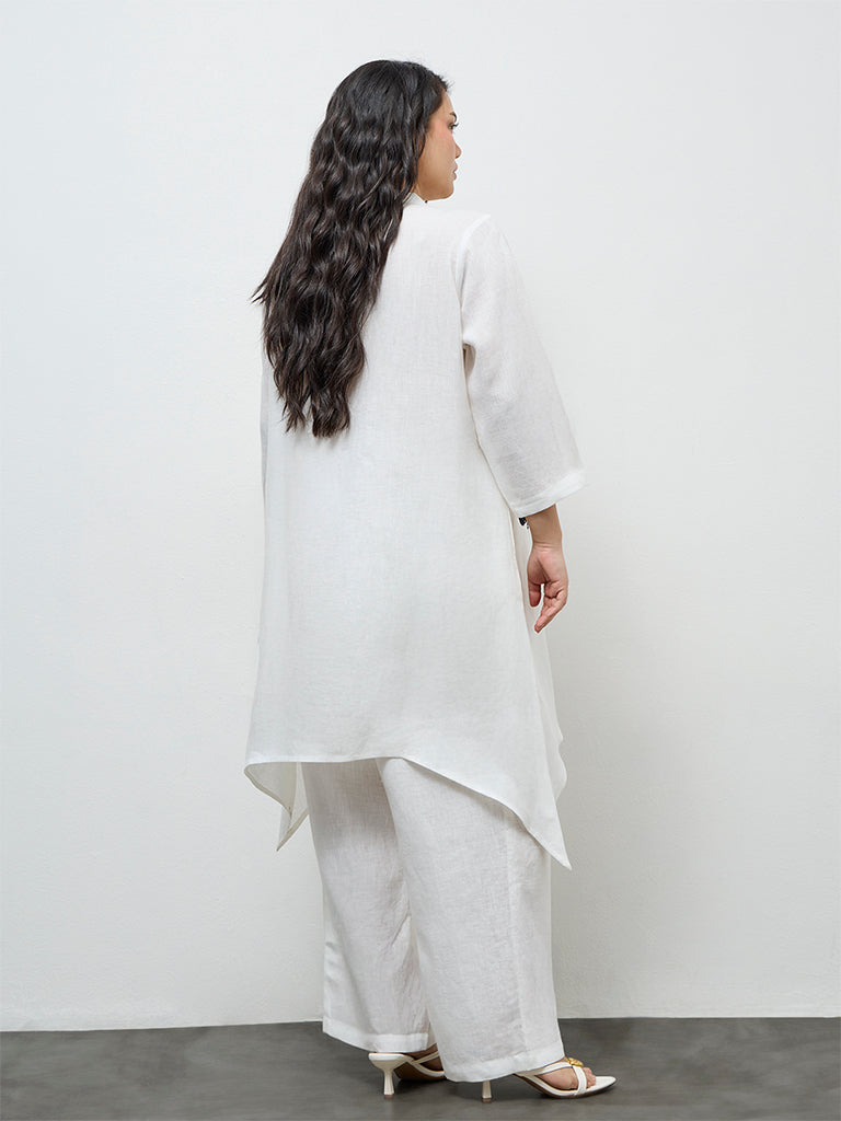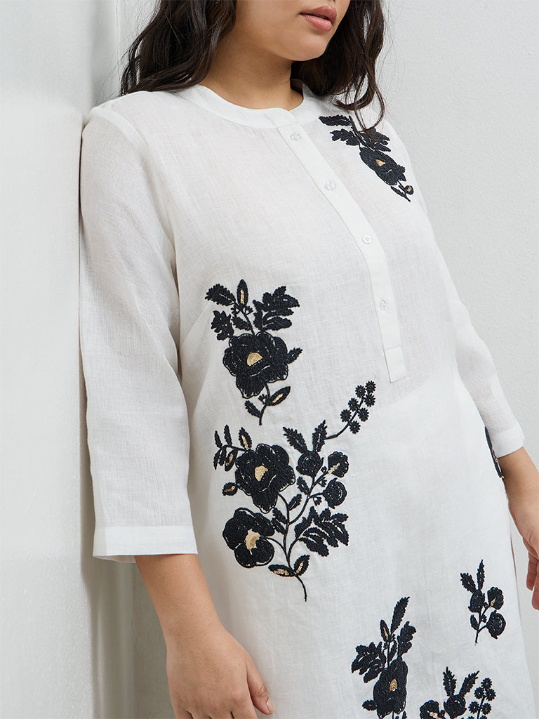 This white kurta from Diza is designed in an A-line shape, carrying a round neckline, button-up front and full sleeves. The striking floral motifs elevates its composed charm while the sumptuous linen fabric offers enduring comfort suited to long hours. Finished with functional side pockets, this piece brings effortless elegance to your everyday ethnic wear rotation.