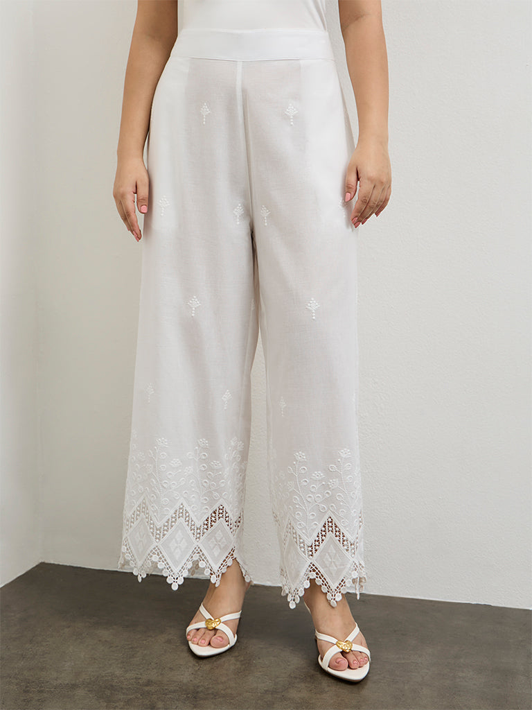 Diza White Lace-Embroidered Pants