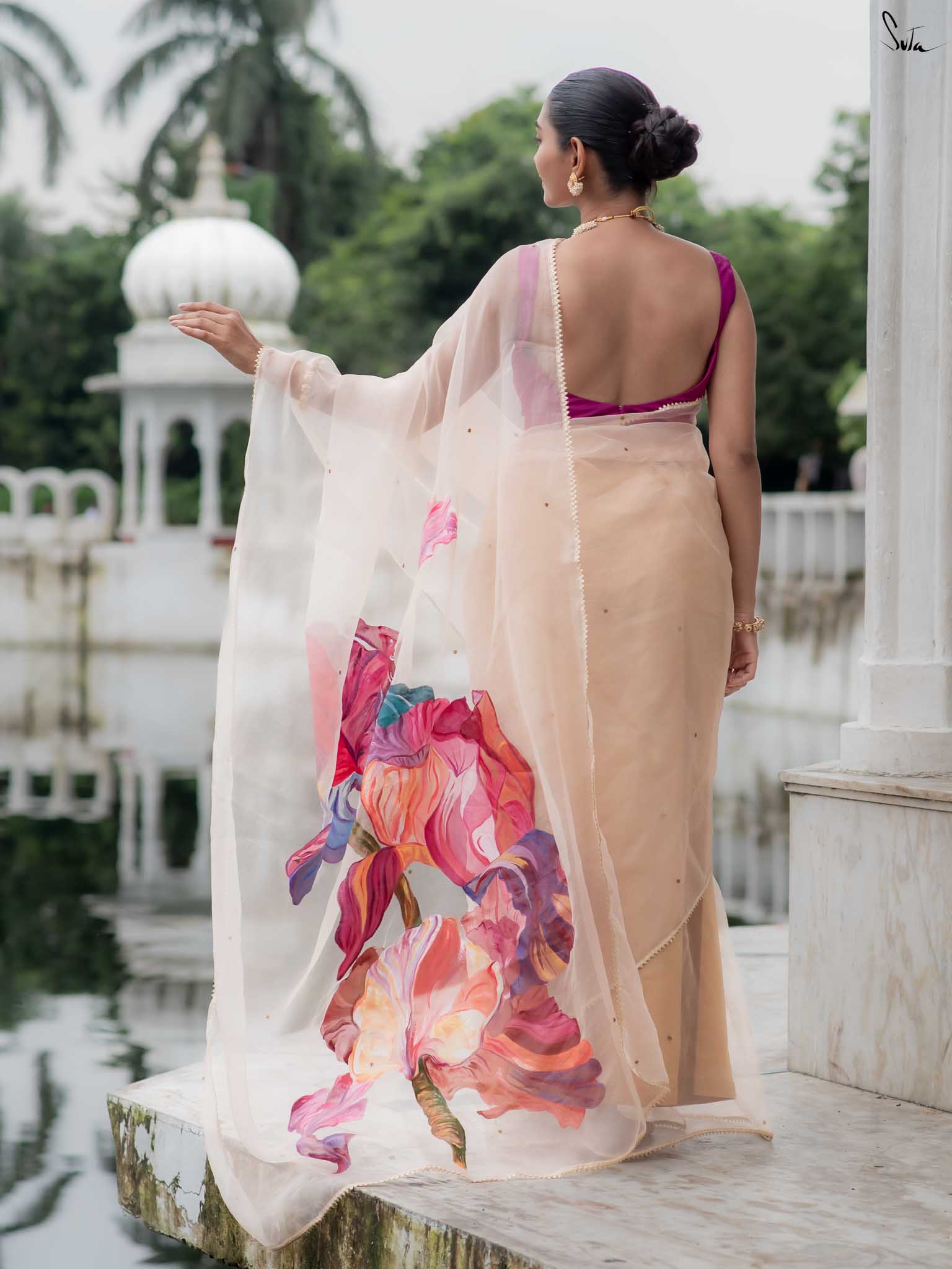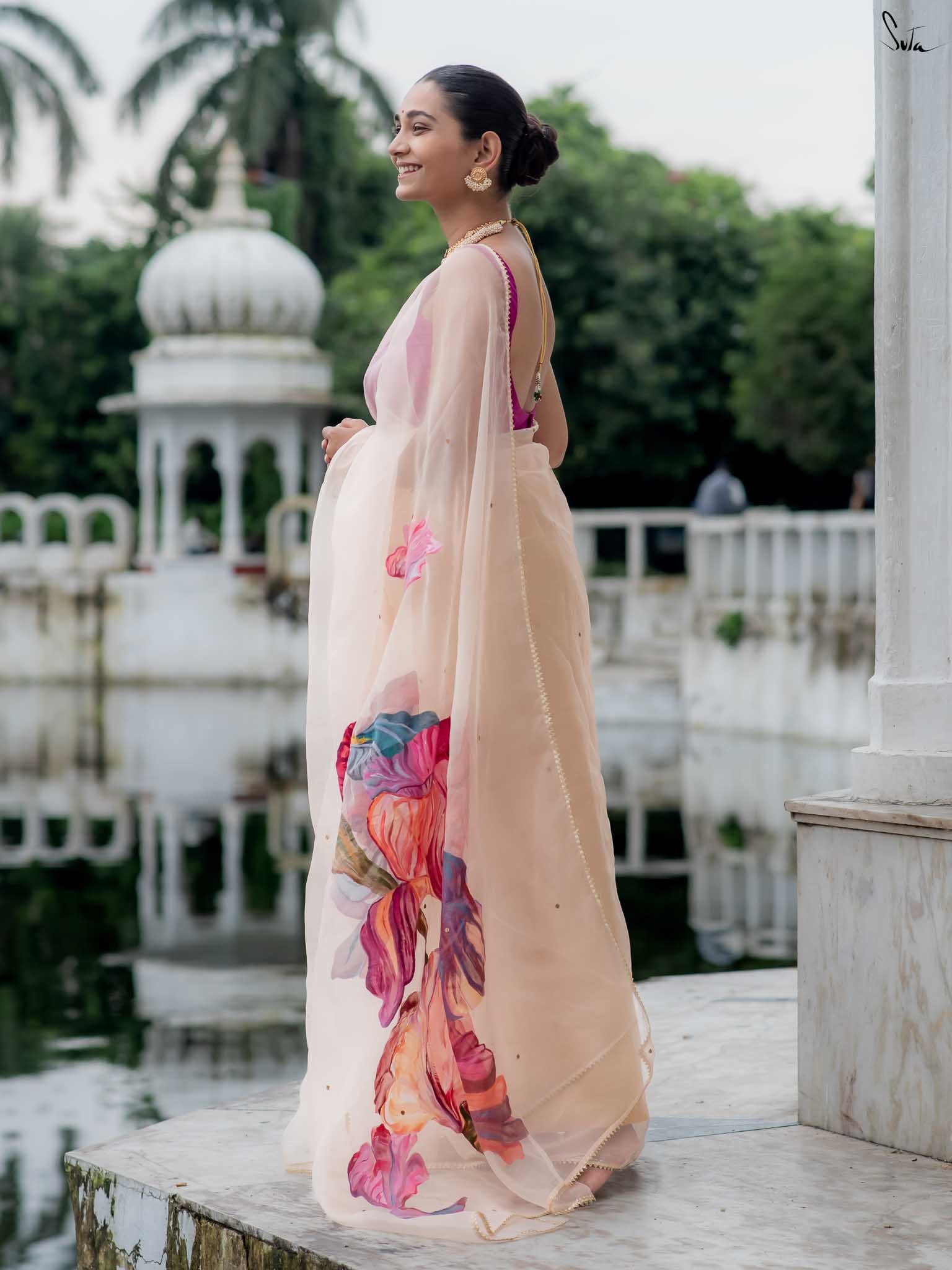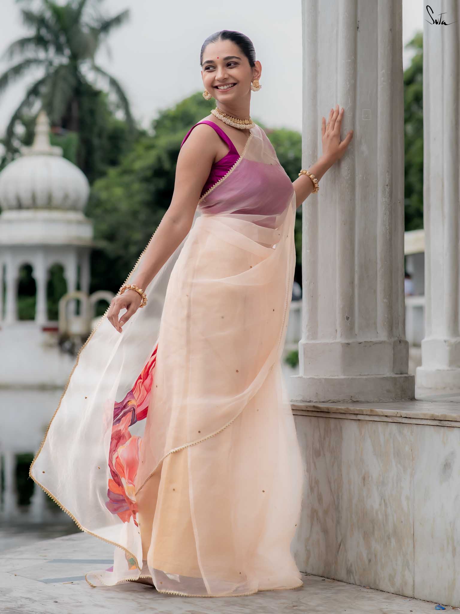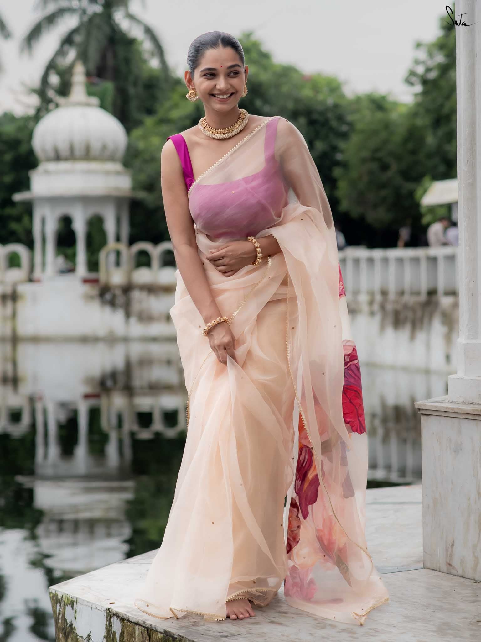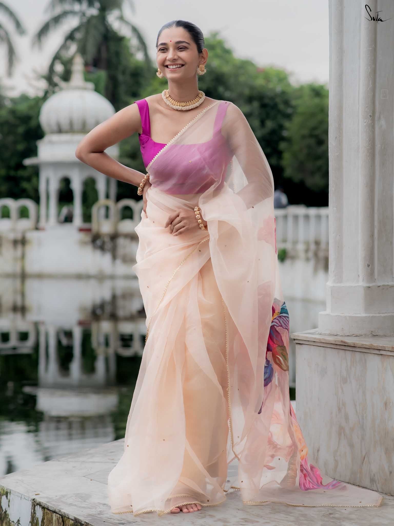 Light as air and translucent like a rainbow, organza silk is a fabric that exudes delicate grandeur. Woven with twisted silk yarn on the warp as well as the weft, this fabric is hailed for its slight transparency and its slightly stiff and yet fluid texture. The slight sheen adds to its charisma, making it the perfect saree to drape for both festive and formal occasions.