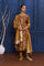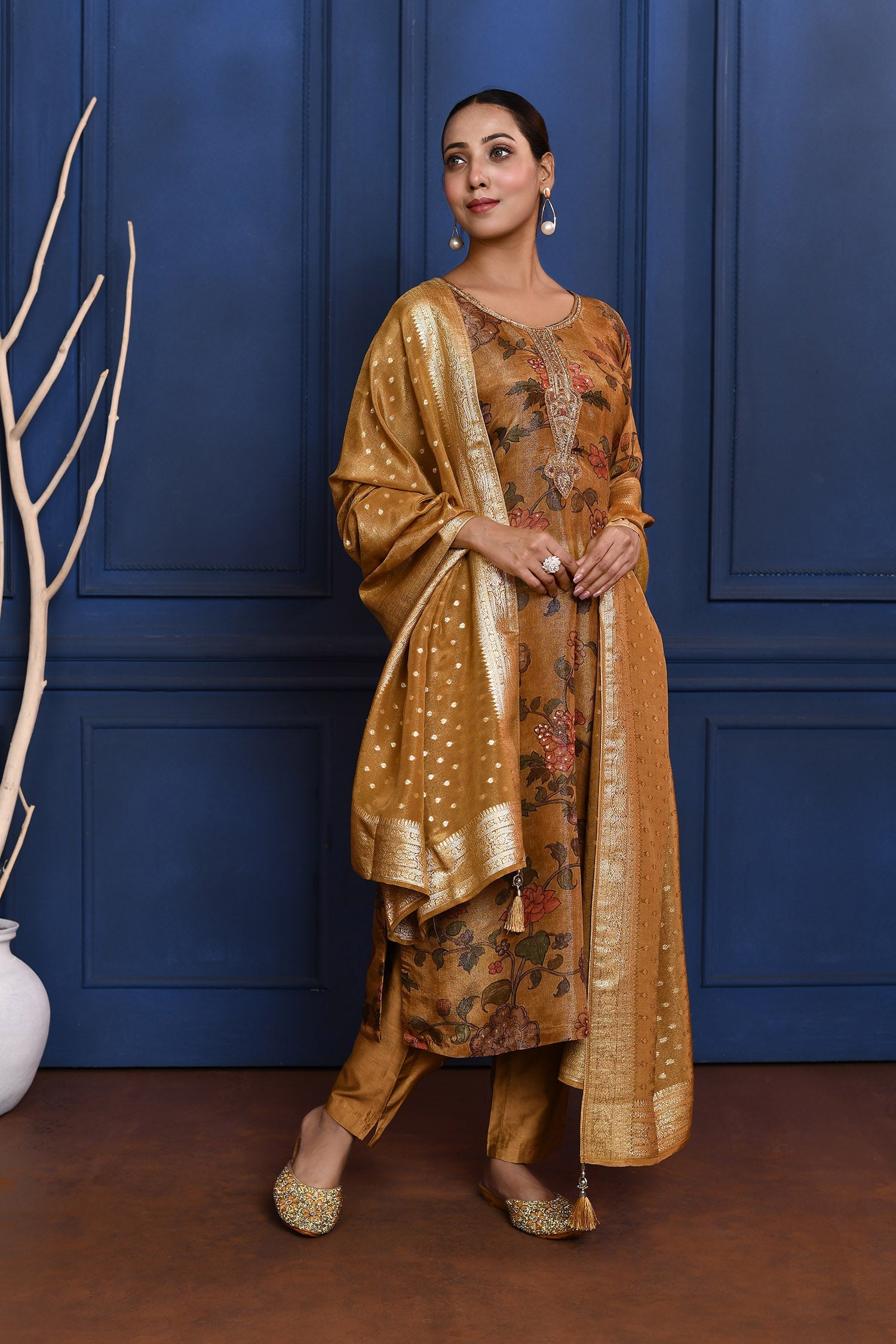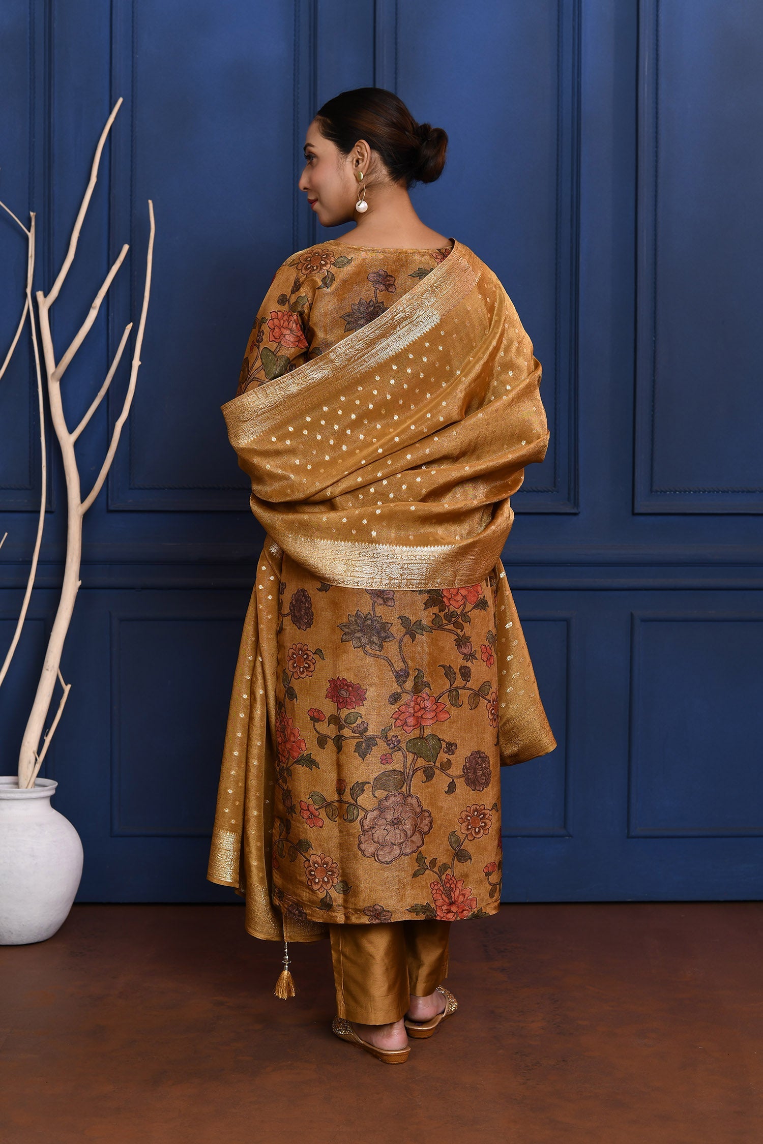 The earthy brown floral printed tissue kurti with matching zari woven dupatta and pant for a decent traditional look with graceful appearance.