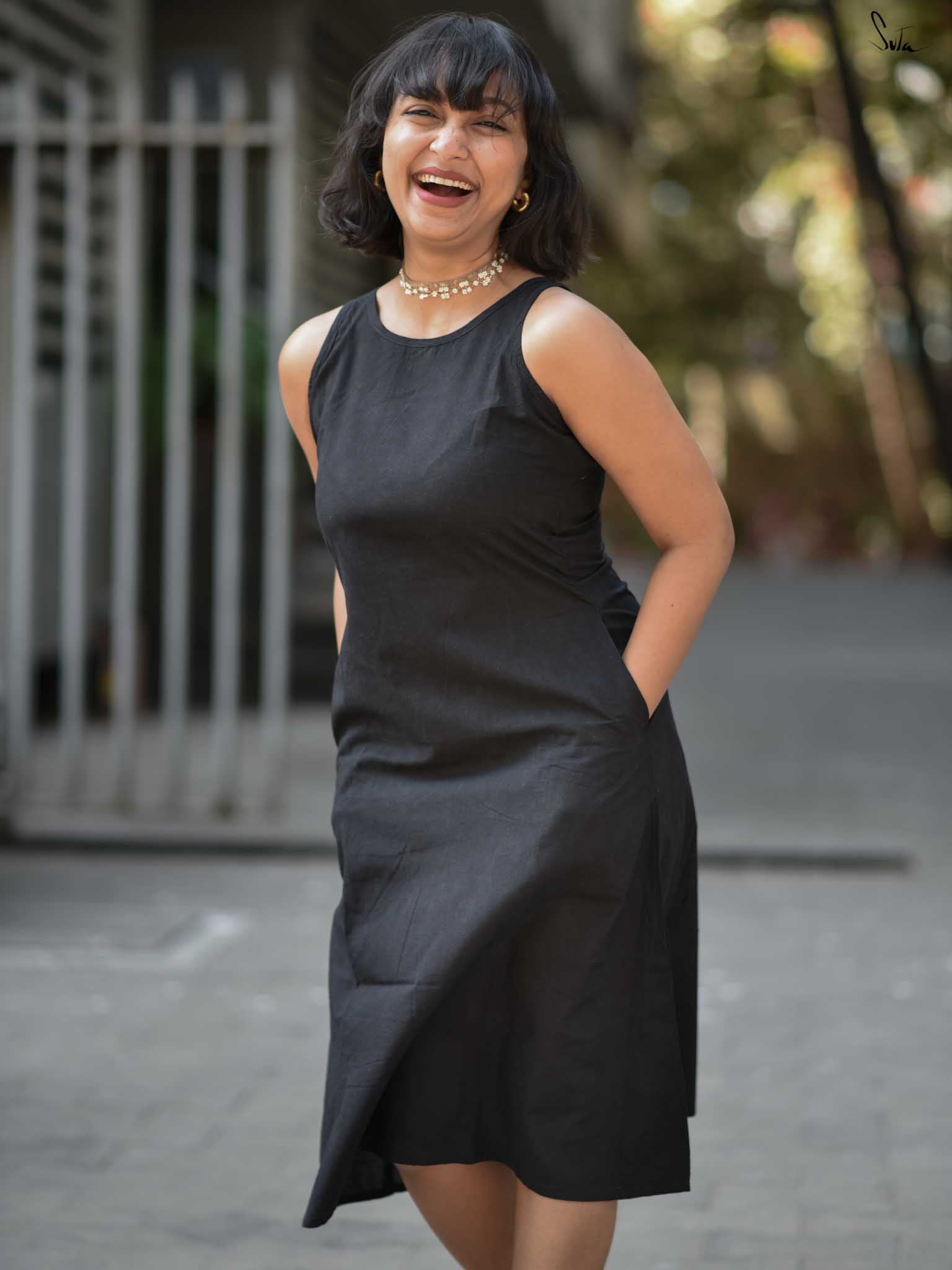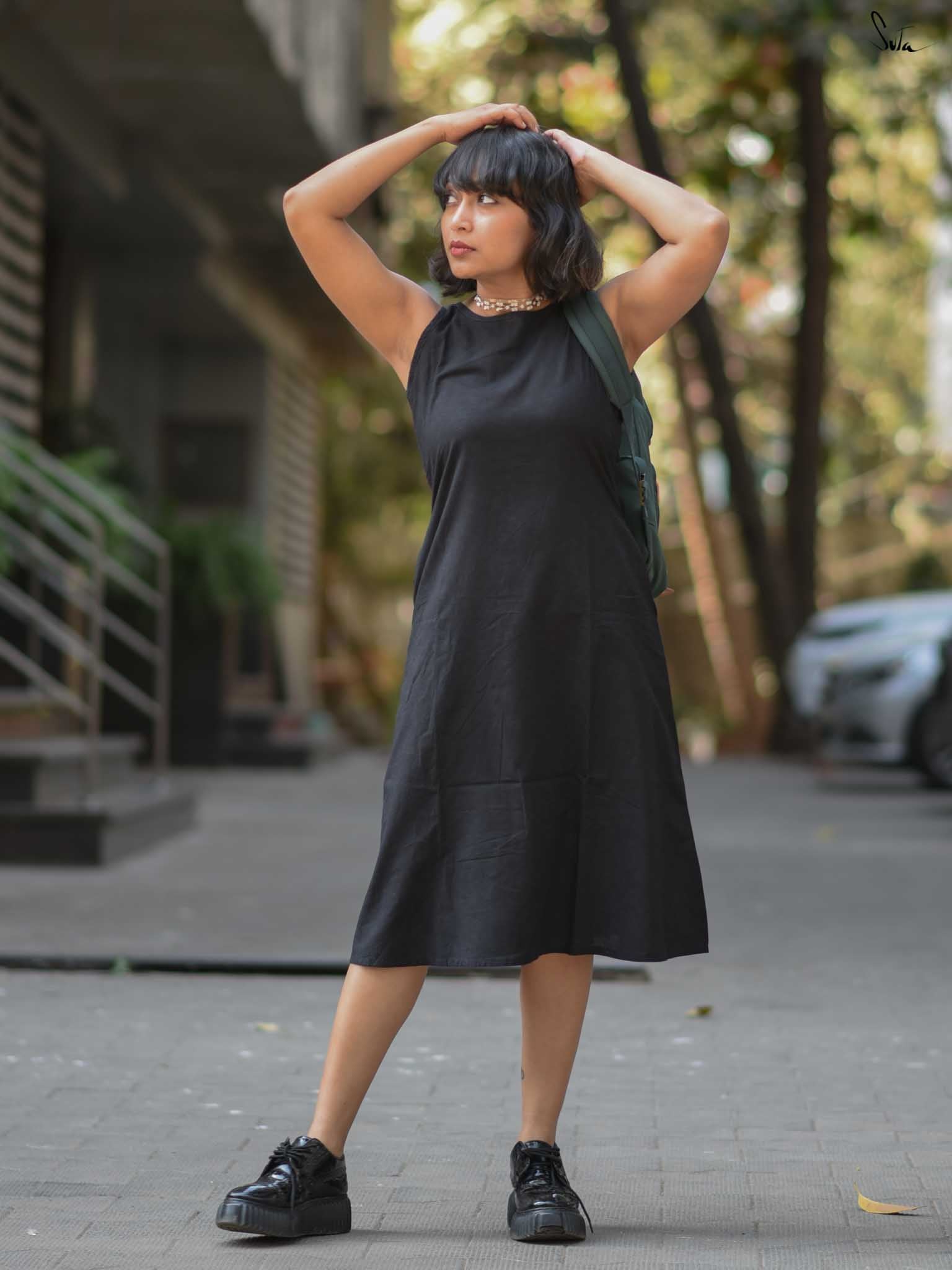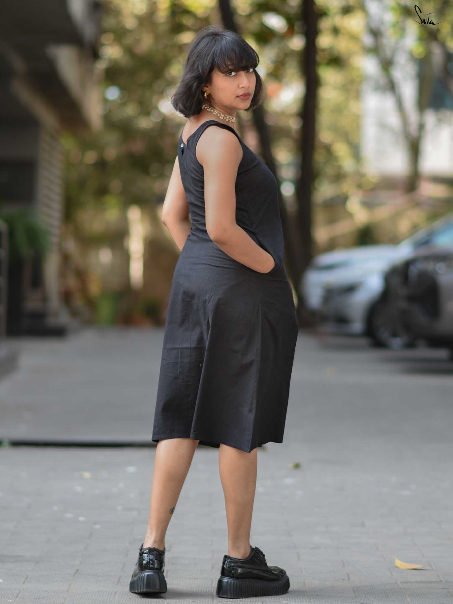 Own the spotlight with a dash of drama, draped in the stylish "Ebony Escape". The black sleeveless cotton dress consists of a chic U-neckline and back button opening, inviting freedom of movement. Its sleek silhouette and sophisticated details evoke a sense of calm, making it a perfect choice for events that demands effortless elegance!