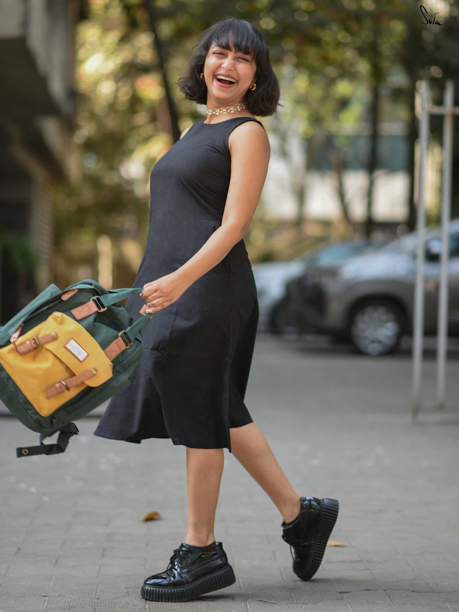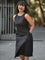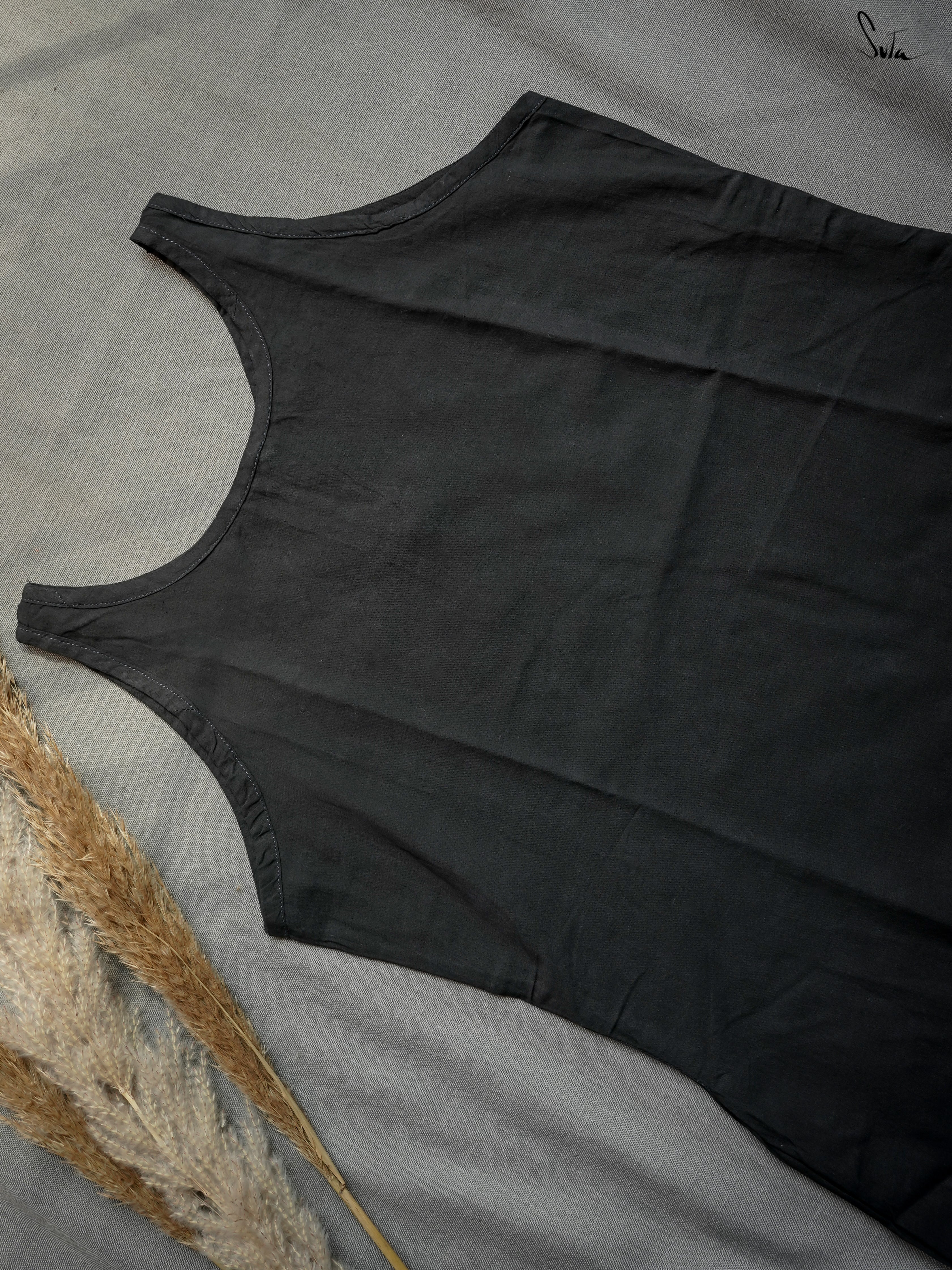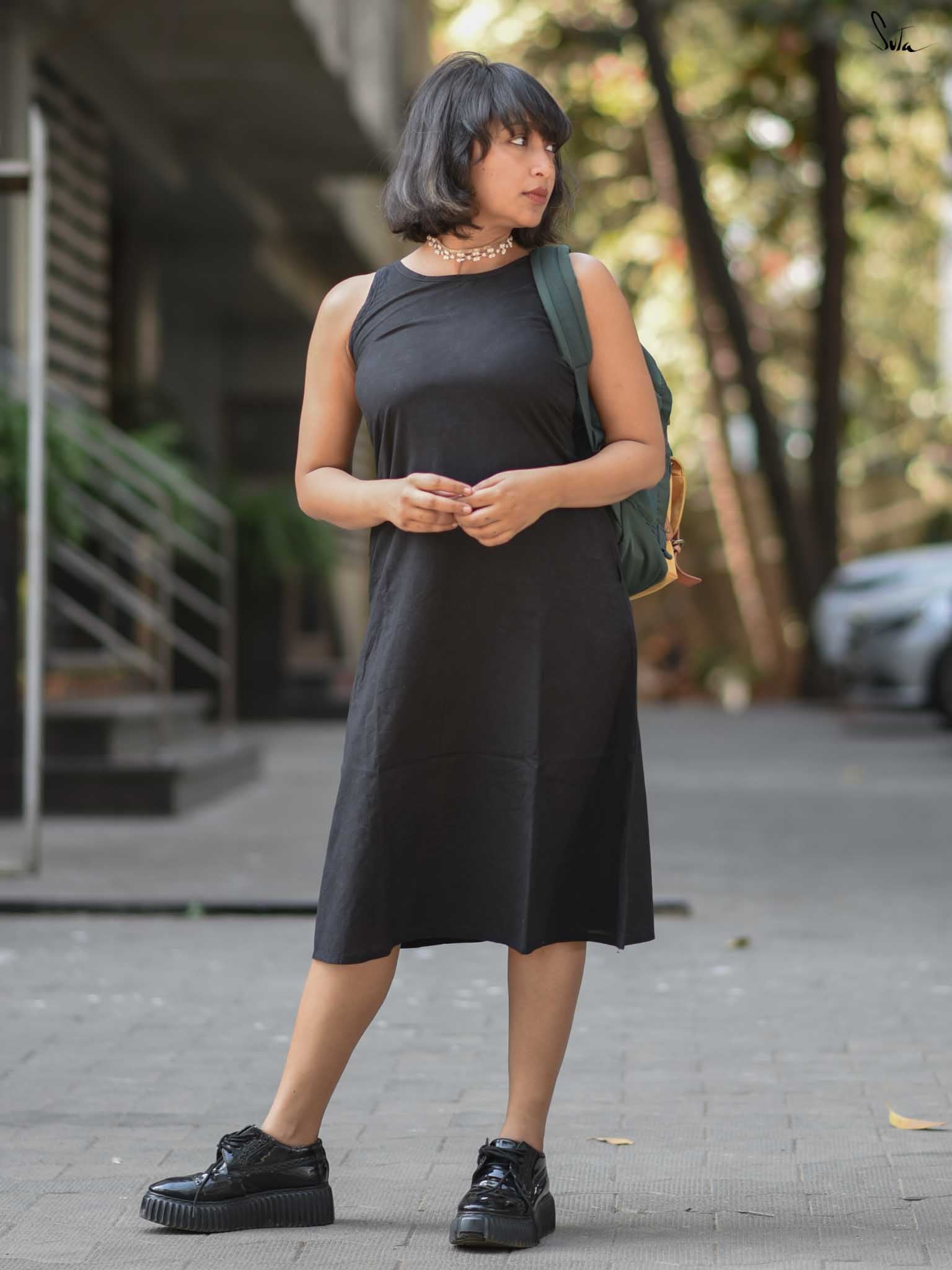 Own the spotlight with a dash of drama, draped in the stylish "Ebony Escape". The black sleeveless cotton dress consists of a chic U-neckline and back button opening, inviting freedom of movement. Its sleek silhouette and sophisticated details evoke a sense of calm, making it a perfect choice for events that demands effortless elegance!