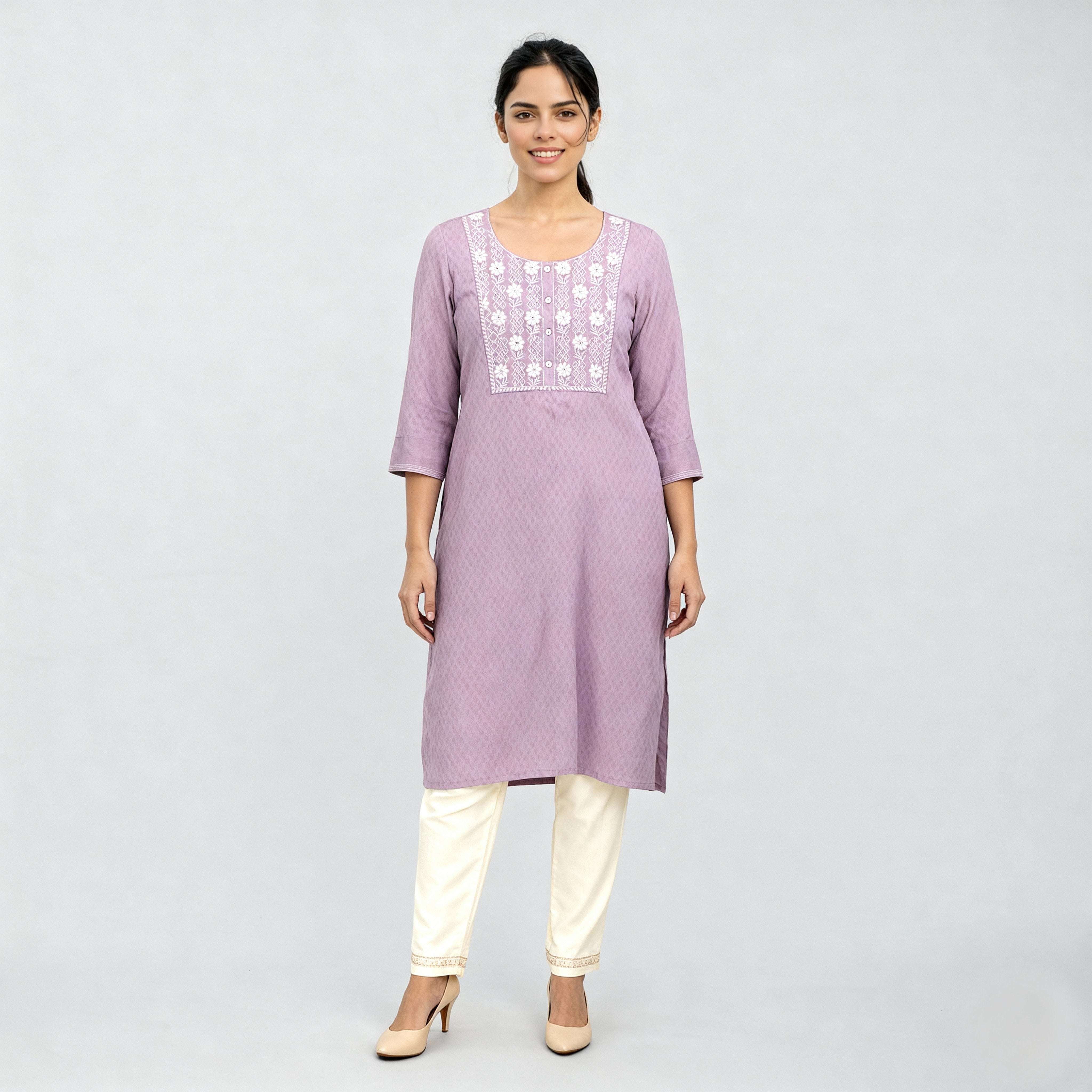 This embroidered pattern kurta has a round neck and three-fourth sleeve. Made from cotton, it is soft and comfortable to wear.