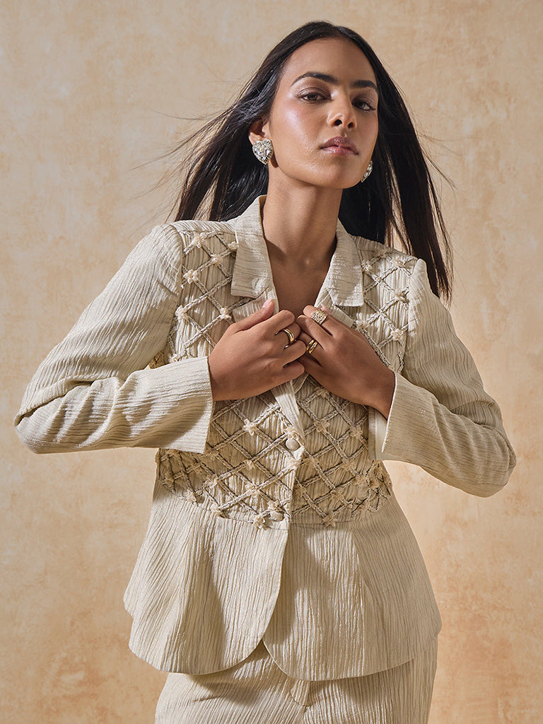 This ivory jacket channels festive sophistication with a modern edge. Tailored in a structured silhouette, it is detailed with intricate thread embroidery in a lattice pattern, creating depth and texture. The notched lapel collar and full sleeves lend a polished finish, making it the perfect statement layer for evening celebrations and cocktail soirées.