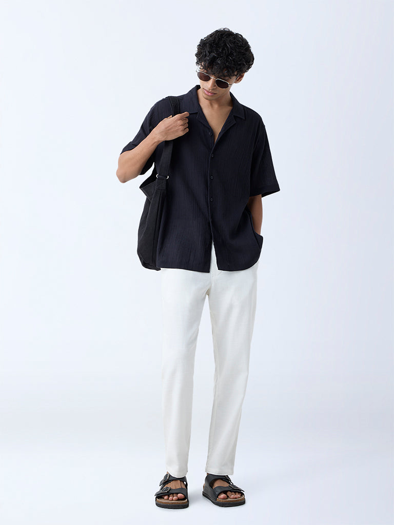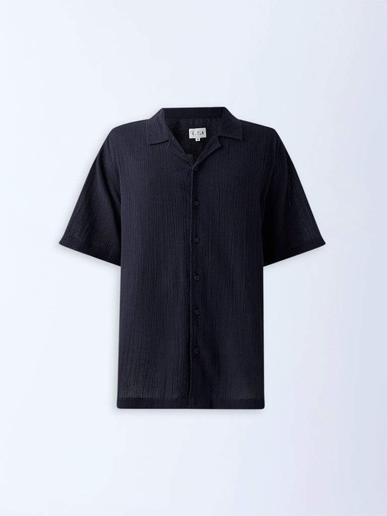 This black shirt from ETA is milled from pure cotton and finished with a subtle crinkle texture for understated character. Cut in a relaxed silhouette, it features a camp collar, half sleeves, and a button placket for easy wear.