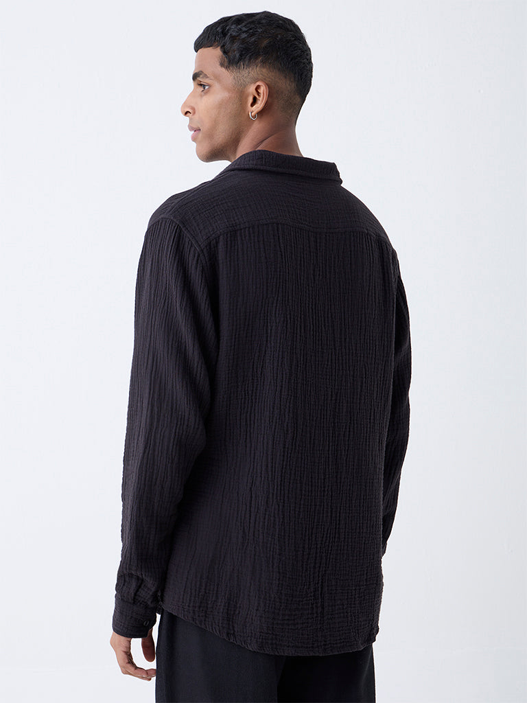 Laid-back yet distinctive, this black shirt from ETA is cut from breathable cotton with a naturally crinkled texture. Designed in a relaxed fit with a spread collar, full sleeves and button-down front, it channels casual ease with a modern finish, making it a versatile staple for resort-inspired styling.