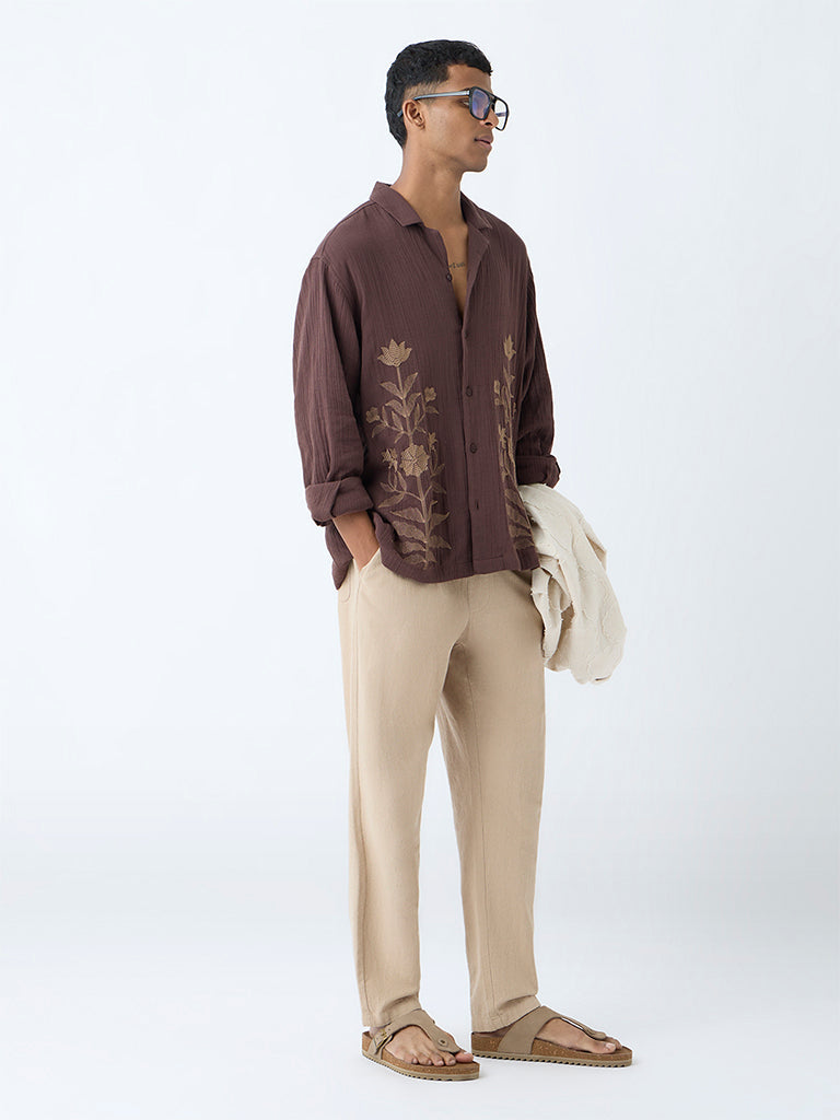 ETA Brown Floral Embroidered Relaxed-Fit Cotton Shirt
