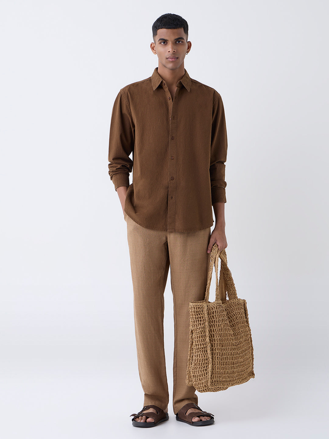ETA Brown Solid Relaxed-Fit Cotton Shirt